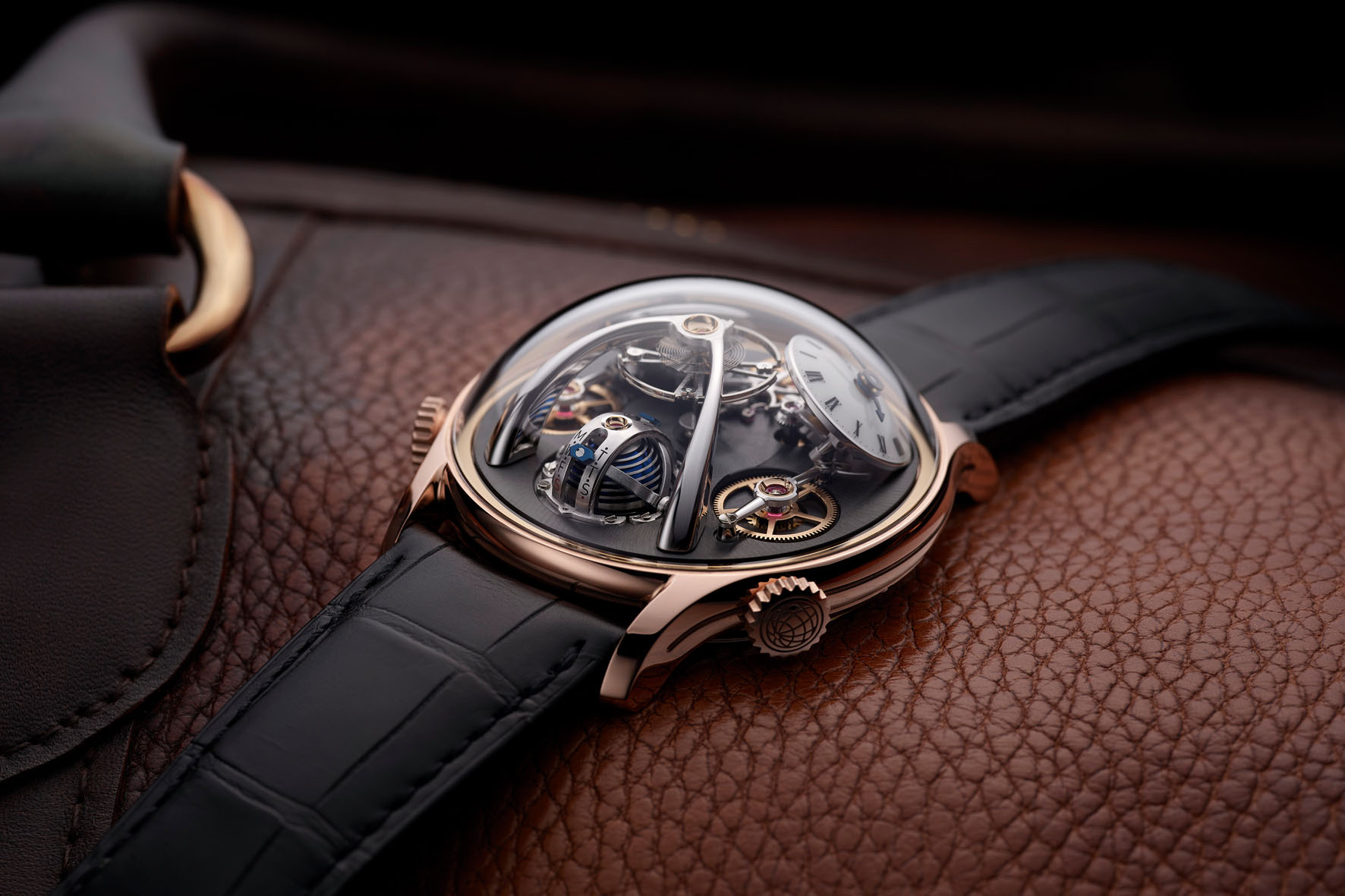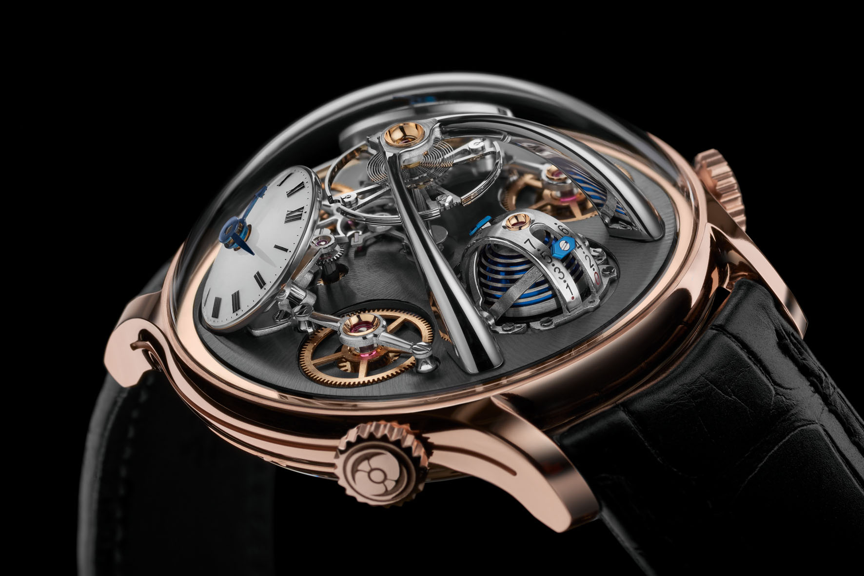 Se nelle prime Legacy Machine gli elementi esposti tra il quadrante e la cupola in vetro zaffiro sono pochi, i modelli successivi (come le LM Perpetual, FlyingT e Thunderdome) mostrano senza riserve la propria prodezza meccanica. La LMX segue la stessa filosofia, rivelando elementi funzionali quali il ponte di scappamento a forma di ascia e alcuni ingranaggi. Tre grandi ruote sono protagoniste in scena: accanto alle corone di carica, due di esse si mettono in moto quando si imposta l’ora sul quadrante corrispondente, mentre l’ingranaggio a ore 6 è la classica ruota dei secondi.