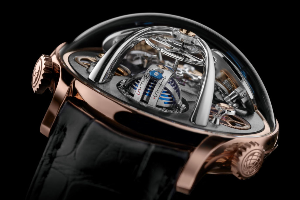 Ennesimo riferimento al primo indicatore di riserva di carica verticale al mondo, presentato con la Legacy Machine No1, la LMX ripercorre la storia di MB&F, con un’esclusiva indicazione tridimensionale dei sette giorni (ben 168 ore!) di riserva di carica del motore.