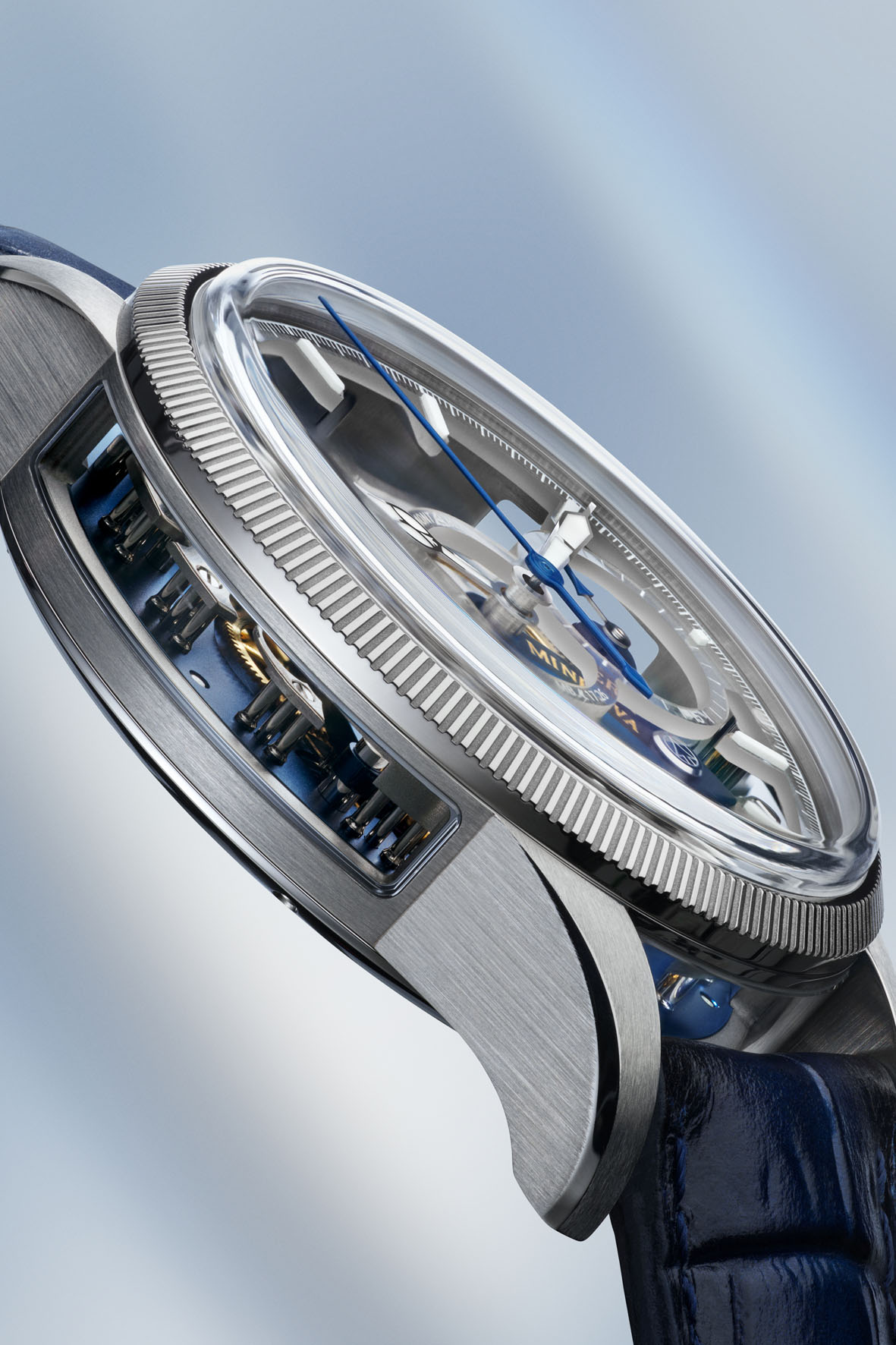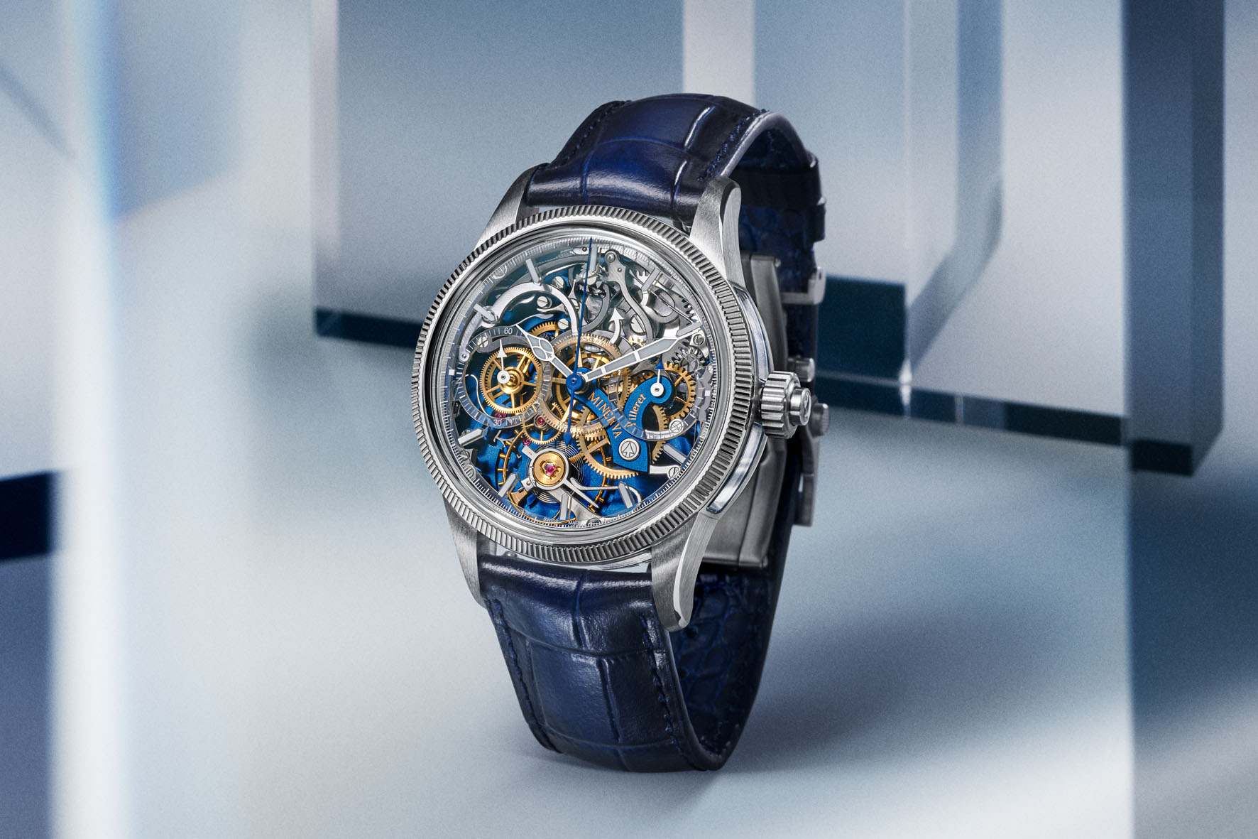 Le platine e i ponti in alpacca sono colorati in una tonalità contemporanea di blu, a contrasto con il resto del movimento, che riprende la tonalità del cinturino in pelle di vitello blu sfumato. Il cronografo è gestito da una ruota a colonne con innesto orizzontale e il calibro MB M17.26 lavora a una frequenza bassa, 18.000 alternanze/ora, con un’autonomia di circa 50 ore. Presenti, come è facile immaginare, sia i ponti a V sia la freccia di Minerva.
