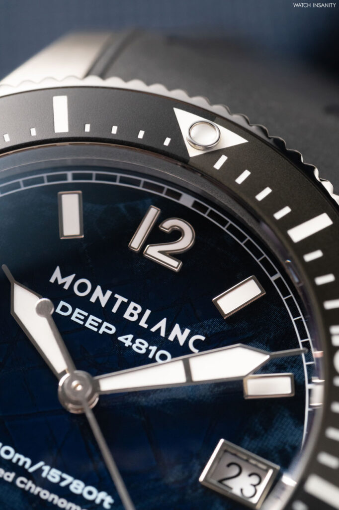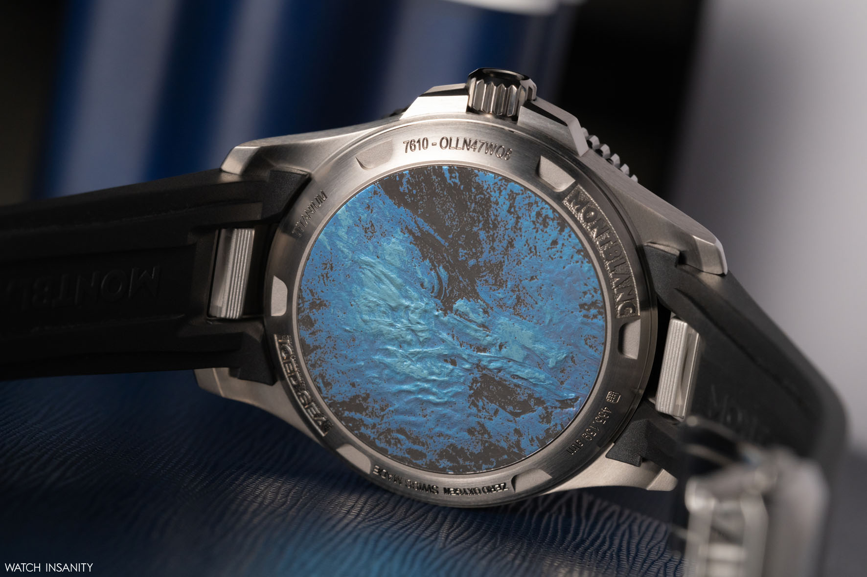 A proposito di fondello, nel caso dell’Iced Sea 0 Oxygen Deep 4810 esso è, a nostro avviso, la vera chicca estetica dell’orologio. È infatti decorato con una texture tridimensionale blu che il brand descrive come la vista subacquea della superficie dell’acqua ghiacciata: in sostanza ciò dovrebbero vedere i diver, guardando all’insù, quando si immergono in un lago alpino d’inverno o nei mari artici. Avendolo visto dal vivo, confermiamo che l’effetto è davvero bello, molto seducente: peccato che, stando sul fondello, sia nascosto alla vista. Il quadrante, la parte visibile, ha infatti una texture realizzata, come per gli altri Iced Sea, con la tecnica chiamata gratté-boisé, utilizzata per rendere l’impressione dei reticoli di cristalli di uno dei più grandi ghiacciai del Monte Bianco, la Mer de Glace. Il colore blu profondo ammicca agli abissi cui è destinato il segnatempo.