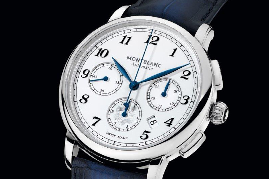 Il cronografo Nicolas Rieussec Star Legacy di Montblanc è impermeabile fino a 30 metri ed è certificato dal Montblanc Laboratory Test 500. È abbinato a un cinturino in alligatore blu e dotato di fibbia déployante tripla. (Prezzo €.7.540)