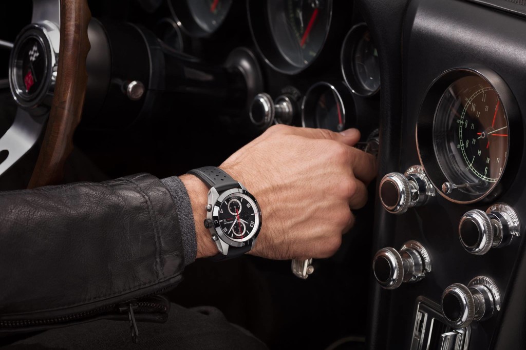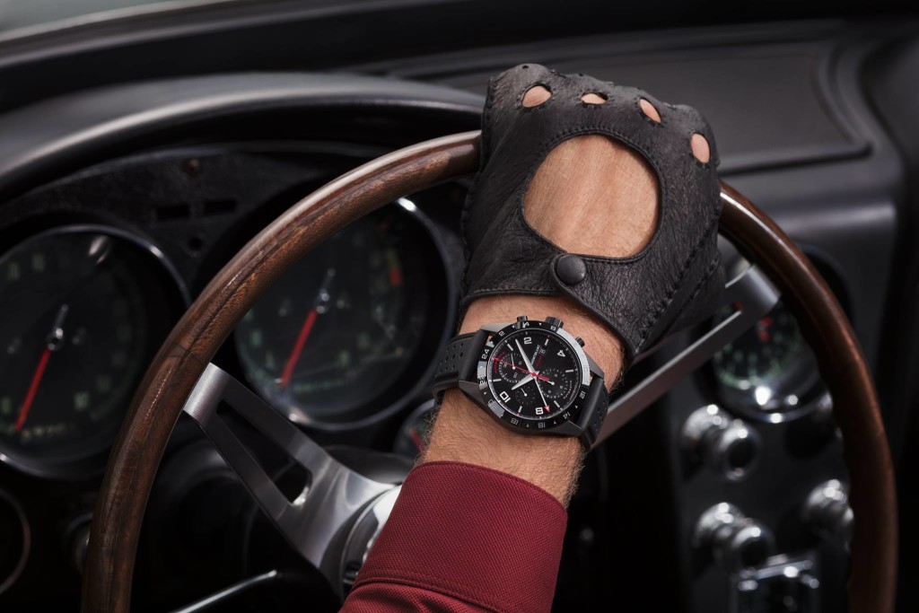 I codici di design dell’automobilismo sportivo si ritrovano nelle anse semischeletrate che ricordano le prese d’aria sul cofano, nella zigrinatura a diamante sulla corona in DLC nero ispirata ai tappi dei serbatoi delle auto da corsa vintage e nei cinturini neri traforati (in pelle o in caucciù) che si rifanno ai guanti da guida indossati un tempo dai piloti. È inoltre disponibile l’opzione di un nuovo, elegante bracciale sportivo in metallo a tre giunzioni. Tutti i cinturini sono dotati di fibbie ad ardiglione in acciaio pregiato satinato.