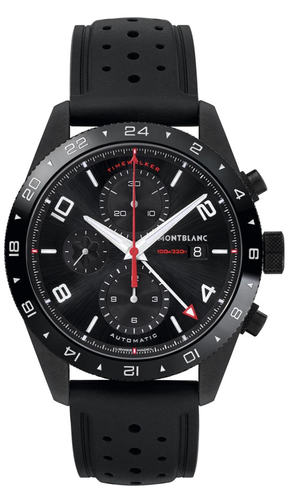 All’interno del Montblanc TimeWalker Chronograph UTC pulsa il calibro MB.25.03, che indica l’ora di tre fusi orari diversi. L’ora locale è segnalata dalle lancette nere rodiate, mentre l’ora di casa è leggibile grazie a una lancetta scura centrale messa in risalto da una freccia rossa in punta, con finitura in SuperLuminova. Le letture sono accompagnate da una scala delle 24 ore sulla lunetta. Il secondo fuso orario si imposta per mezzo della corona, che consente una regolazione semplice e rapida in incrementi di un’ora senza influire sul funzionamento dei minuti. La data è sincronizzata con l’ora locale. Il terzo fuso orario è facilmente leggibile in qualsiasi momento ruotando la lunetta unidirezionale sul nuovo fuso orario, mentre la lancetta delle 24 ore funge da riferimento.