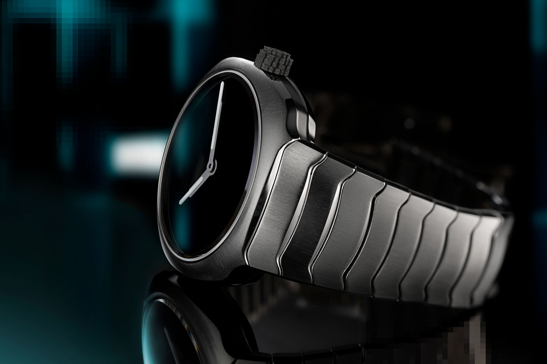 Se l’Endeavour Centre Seconds Genesis si ispirava alle reti invisibili della blockchain, lo Streamliner Genesis 2, secondo capitolo della trilogia, poggia saldamente sul piano del tangibile. Ritorna alla realtà percettibile, a ciò che può essere esplorato con i sensi e lambito dalla luce. Trasmette una sensazione di gravità silenziosa, tipica di quegli oggetti che non devono dimostrare nulla, eppure hanno molto da dire. La cassa cushion in acciaio da 40mm, scolpita con precisione, si adatta perfettamente al polso, mentre il bracciale integrato, con le sue maglie avvolgenti, tramanda le cifre stilistiche della collezione Streamliner riprendendone le finiture. Sul quadrante, il Vantablack cattura la luce, assorbendo il 99,965% dello spettro visibile. Questo materiale nero assoluto, della tonalità più scura mai realizzata, mette in risalto le lancette delle ore e dei minuti, adornate da inserti in Globolight. Il loro aspetto pixelato rimanda alla lunetta e alla corona del primo Genesis, reinterpretandole in una chiave più sobria e introspettiva.