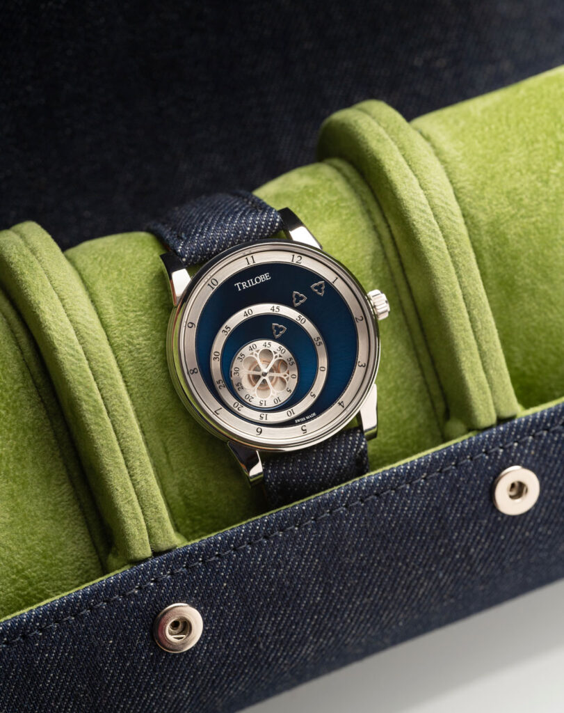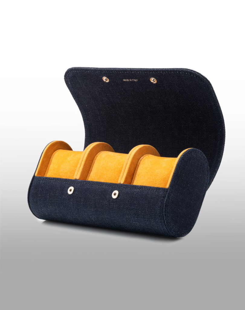 Abbiamo parlato all’inizio di tubi porta orologi in pelle. Potevano mancare quelli in denim Candiani? Certo che no. Eccoli allora, a tre posti, in denim blu KR7176 KN-Durance Rinser con quattro differenti colori per l’interno: blu, arancione, verde e giallo. Colori vitaminici, dalla forte personalità, che lasciano libero sfogo all’umore e alla fantasia di chi vuole acquistare il tubo.
