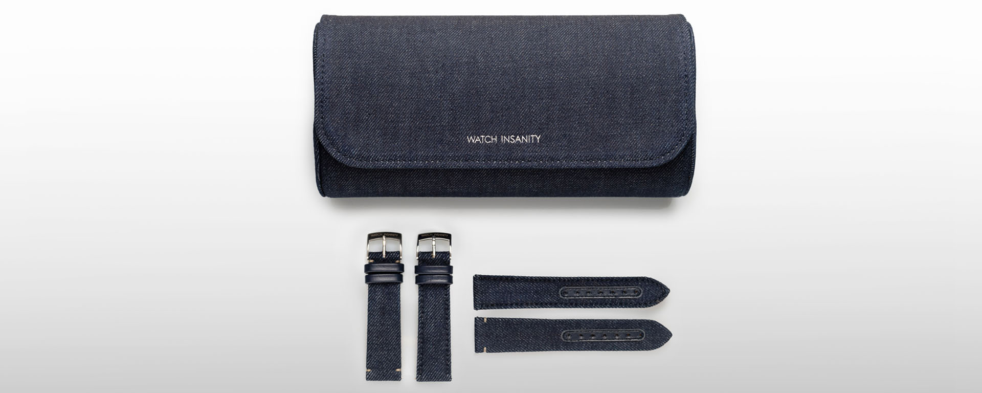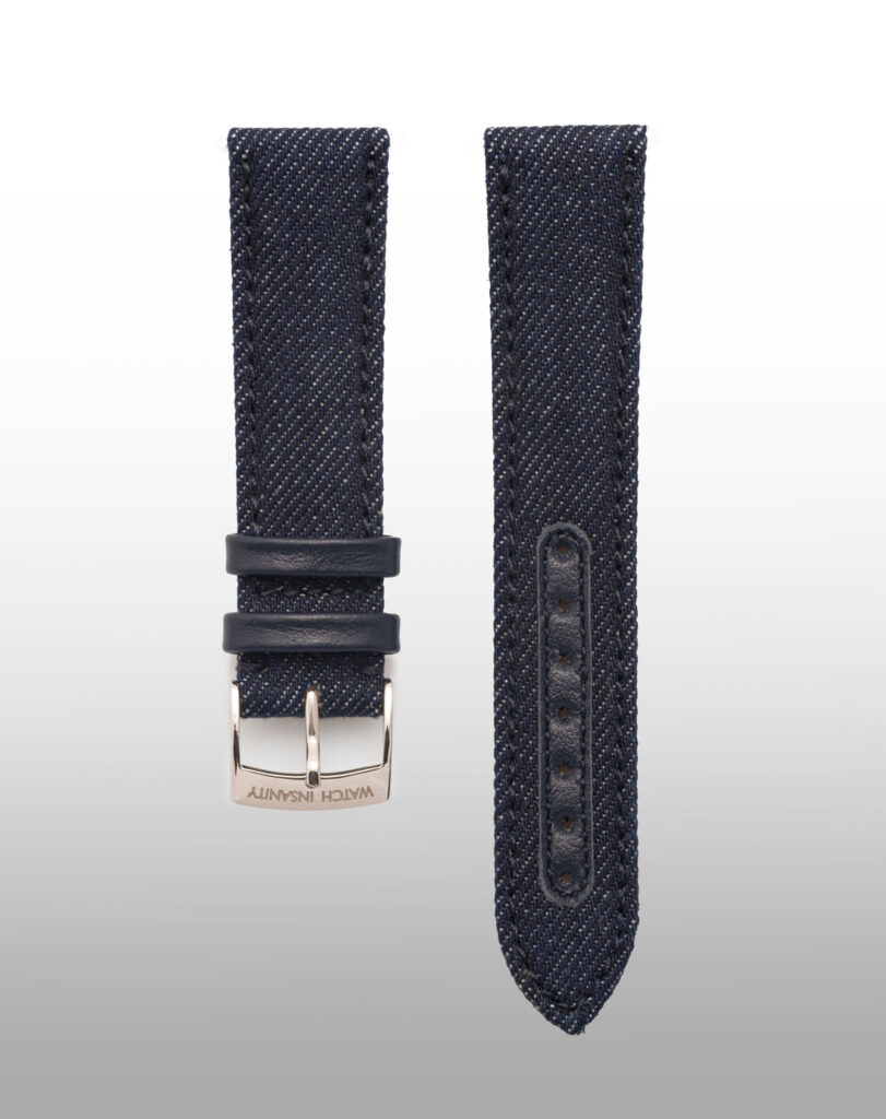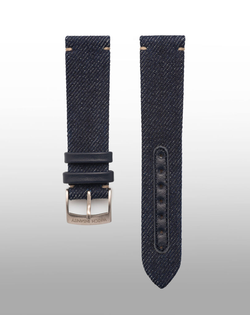 I cinturini sono di due tipi: MENTANA, un “modello dal tocco vintage” in denim KR7176 KN-Durance Rinser blu con fodera interna in pelle di vitello color arancione, ribordato e con cuciture laterali écru; TIC, un “modello contemporaneo” in denim KR7176 KN-Durance Rinser blu con fodera interna in pelle di vitello color arancione, ribordato e demi-bobé con cuciture tono su tono. Ciascun cinturino è abbinato a una fibbia ad ardiglione personalizzata WATCH INSANITY, disponibile sia lucida sia satinata.