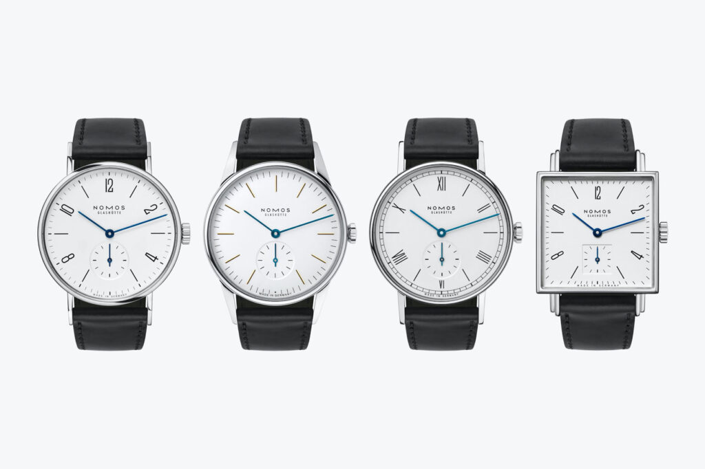 Nel 1992, a due anni dalla fondazione, vengono presentati i quattro modelli che costituiscono i pilastri della maison: Tangente, Orion, Ludwig e Tetra. Sebbene differenti nelle forme — rotonde per Tangente, Orion e Ludwig; quadrata per Tetra — tutti condividono la medesima impostazione progettuale, proporzioni e meccanica. La cassa in acciaio, il vetro zaffiro (in alcune versioni) e il fondello a vista sono completati da un quadrante in pieno stile Bauhaus con piccoli secondi ad ore 6, sfere azzurrate e indici romani/arabi. Sul fronte tecnico, Nomos lavora con una versione personalizzata e perfezionata del Peseux 7001 (calibro a carica manuale rinomato per la sua grande affidabilità, sottigliezza e facilità di manutenzione).