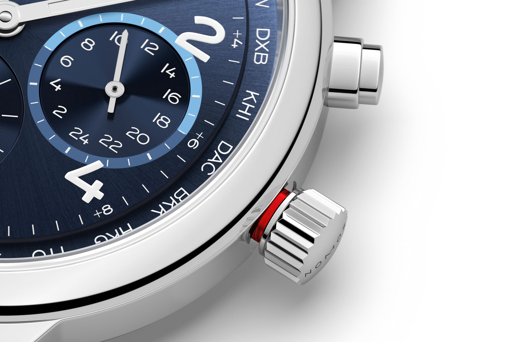 Sul quadrante le sfere e la secondina fanno riferimento all’ora locale mentre l’anello periferico è dedicato al disco delle città, modificabile tramite il tasto ad ore 2 (che simultaneamente fa avanzare la sfera delle ore locali a scatti di un’ora). Il contatore ad ore 3 suggerisce invece l’orario di casa su display da 24 ore, accompagnato da un anello bicolore che funge da indicatore giorno/notte. Sul fianco della cassa, in corrispondenza delle ore 8, è presente un piccolo pulsante incassato che consente di sincronizzare i quadranti agendo sulla sfera delle ore del contatore. Una volta allineati i due orari, il pulsante alle ore 2 serve unicamente per cambiare fuso orario attraversando i confini.