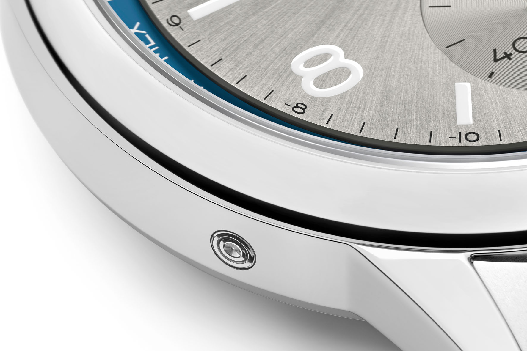 La finitura lucida della cassa gioca sapientemente con la luce, mentre il bracciale in acciaio a tre file alterna con eleganza maglie centrali lucide e laterali satinate. E per completare l’assetto sportivo non potevano mancare: il sistema di sgancio rapido che permette di cambiare bracciale/cinturino in totale autonomia e senza strumenti, e la comoda chiusura pieghevole con micro regolazioni.