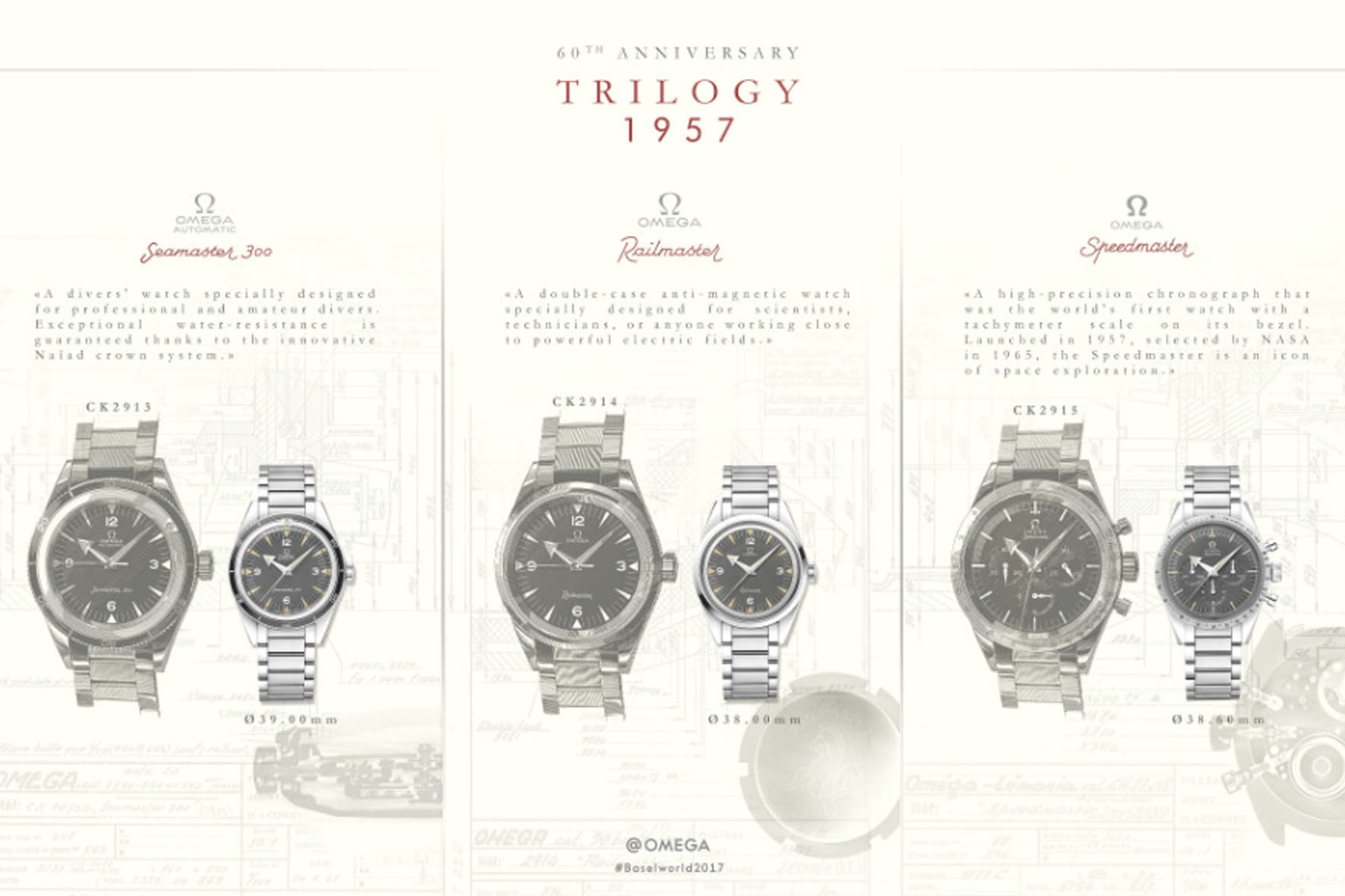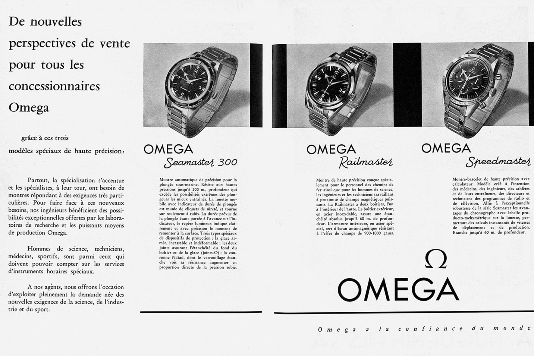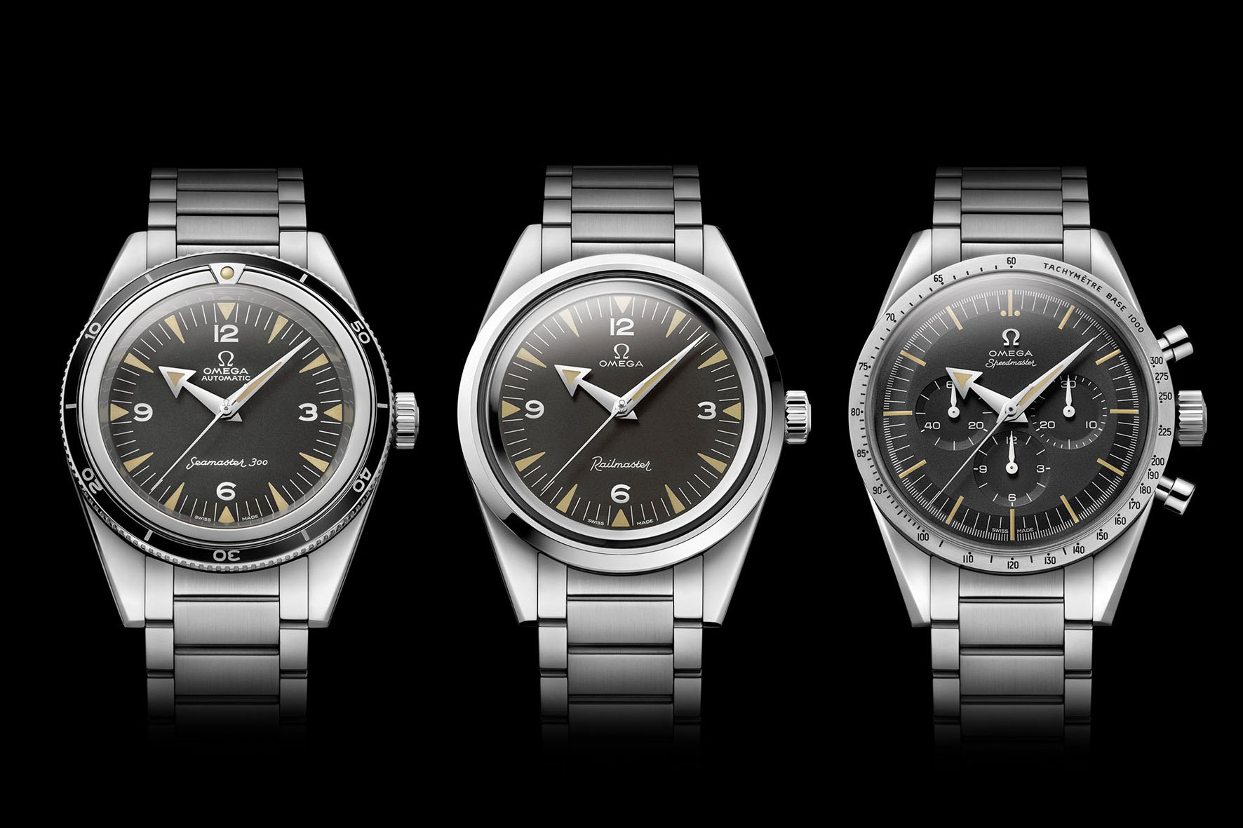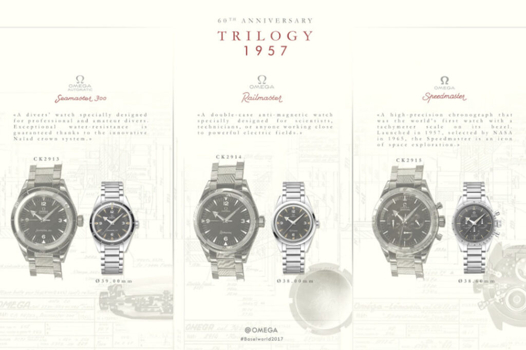 Agli esordi nessuno di questi tre modelli ebbe un successo immediato. Fu infatti necessaria un’adozione industriale specifica per ciascuno di essi perché superassero le difficoltà del lancio. Il Seamaster divenne un subacqueo per uso militare; lo Speedmaster si trasformò da cronografo da pista a strumento spaziale; il Railmaster rimase un tipo di orologio specifico, di nicchia, che difficilmente sarebbe stato dato in dotazione ai responsabili delle linee ferroviarie.