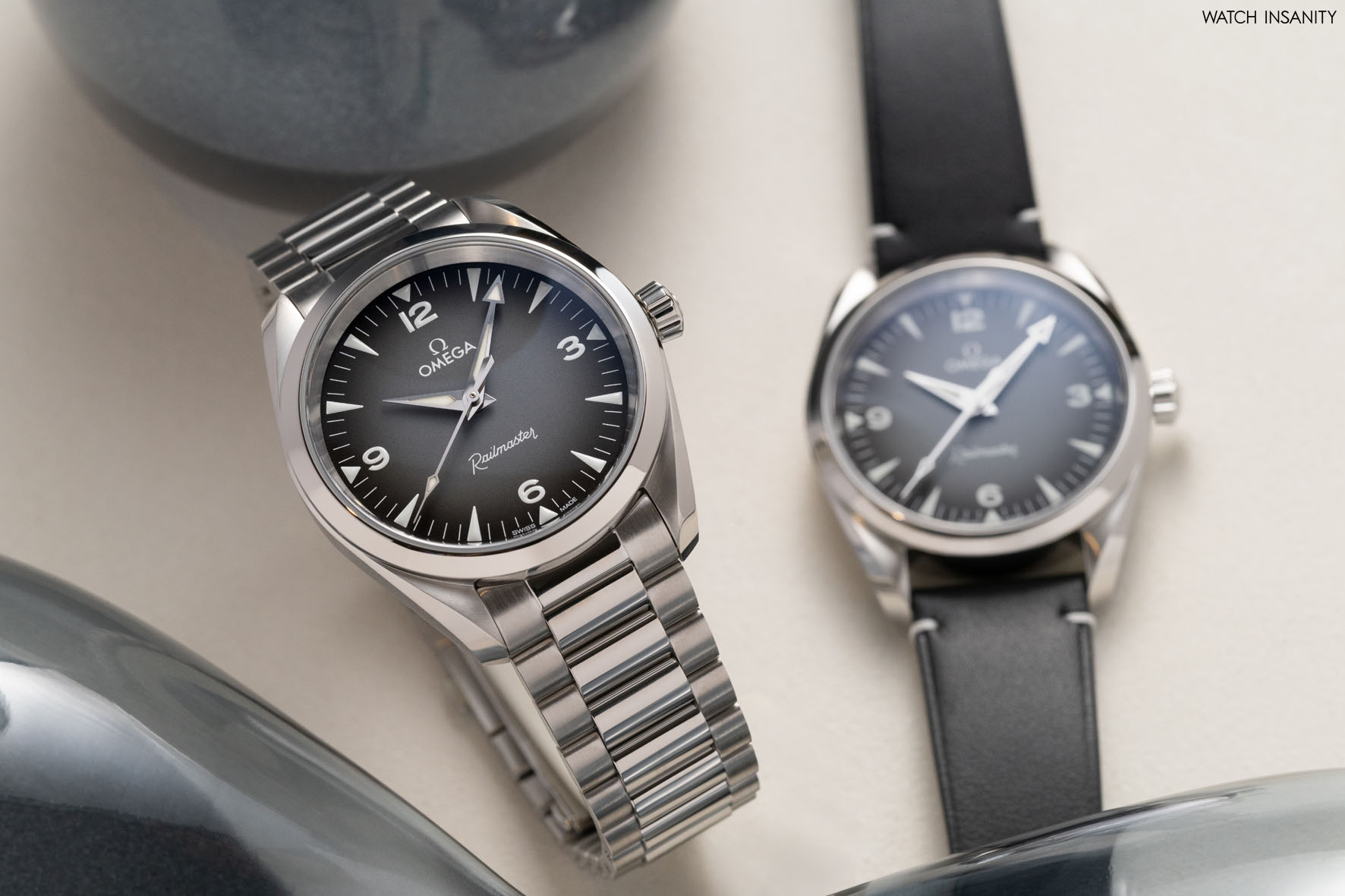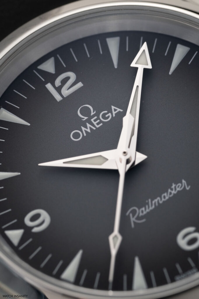 Ciò che distingue i due modelli, oltre alla scelta tra cinturino e bracciale, è il quadrante, sul quale Omega ha svolto un lavoro notevole. In uno dei due modelli è grigio nella parte centrale, con una sfumatura che tende al nero verso la periferia. Ospita solo il logo e il nome di Omega a ore 12 e la scritta Railmaster in caratteri vintage a ore 6. Nessun’altra scritta né indicazione e neppure una finestra per il datario a “sporcare” l’estetica di un quadrante da vero tool watch. Gli indici triangolari e i numeri arabi al 3, 6, 9 e 12 sono riempiti di Super-LumiNova bianca, così come le lancette a daga di ore e minuti (con il classico freccione su quella dei minuti) e la punta della lancetta dei secondi centrali.