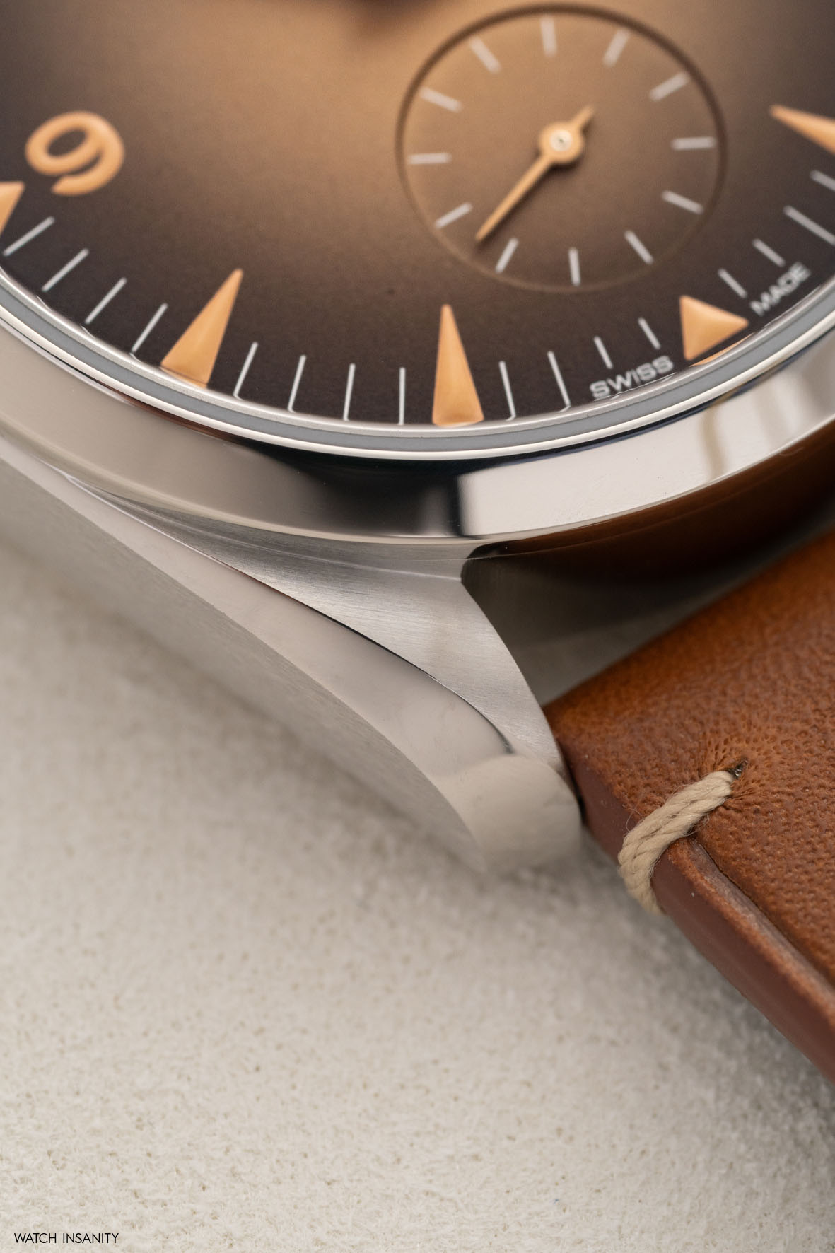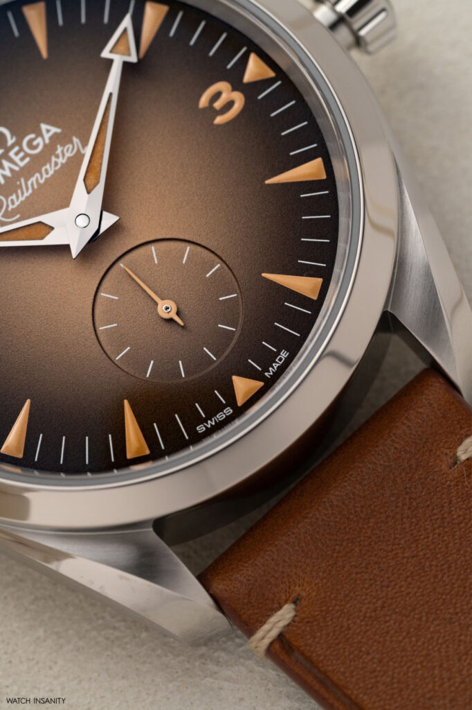 Anche il quadrante del secondo Railmaster è sfumato, ma è beige al centro e tende al nero verso la periferia. A differenza della precedente referenza, non ha i secondi centrali ma un contatore dei piccoli secondi a ore 6, elegantemente svasato. Il Super-LumiNova di indici, numeri e lancette è beige, con un intrigante effetto vintage.