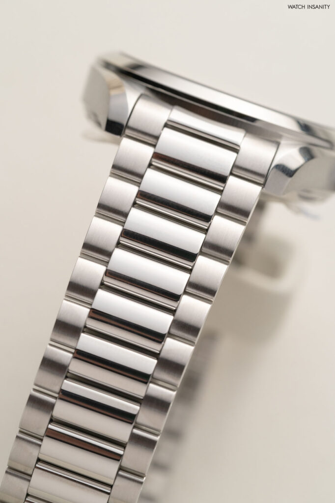 Sono tutte casse in acciaio, caratterizzate dalla lunetta e dalle anse lucide e dalla carrure satinata. Le anse sono corte, come negli Aqua Terra, e aiutano la vestibilità dell’orologio, che è proposto sia con un cinturino in pelle di vitello, sia con un bracciale in acciaio a tre file, quella centrale lucida e quelle laterali satinate. Cinturino e bracciale hanno la fibbia pieghevole, che nel bracciale è a farfalla.