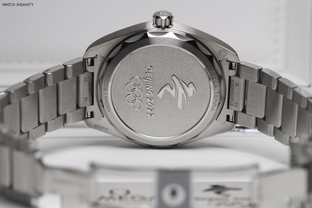 A differenza dell’Aqua Terra realizzato per i Giochi Olimpici di Tokyo 2020 (che, peraltro, era in edizione limitata), questo orologio ha il fondello avvitato in solido acciaio e non in vetro zaffiro. Anch’esso è lavorato in modo da ricordare la granulosità della neve e ha inciso a rilievo al centro il logo di Pechino 2022.