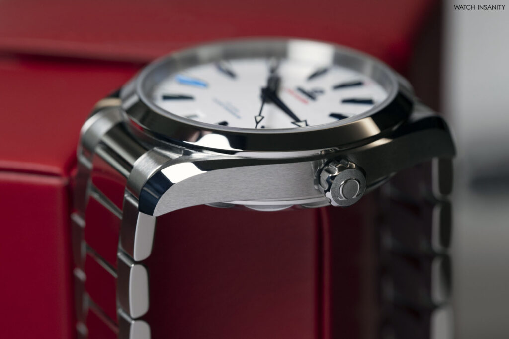 Il segnatempo conserva tutte le caratteristiche della versione classica dell’Aqua Terra: lunetta lucida scalettata che incornicia un vetro zaffiro bombato con trattamento antiriflesso, cassa con le tipiche anse avvolgenti, alternanza di finiture lucide e satinate (specialmente tra carrure e lunetta), corona conica avvitata il cui design è stato recentemente aggiornato, impermeabilità fino a 15 bar, finestra del datario a ore 6.