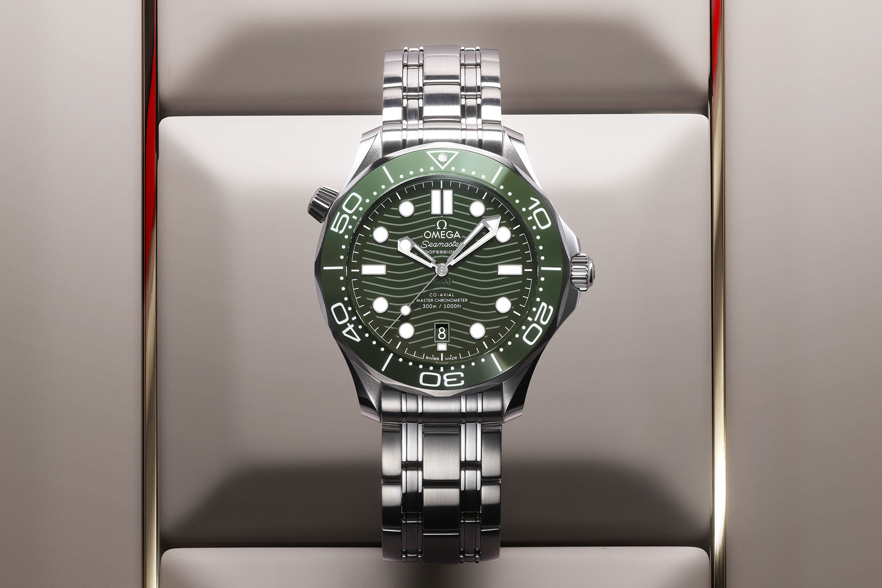 8 Marzo 2022Lanciato nel 1993, il Seamaster Diver 300 torna nel 2022 più audace che mai con un nuovo quadrante in ceramica lucida con motivo a onde inciso a laser in una sorprendente tonalità di verde. La cassa, da 42 mm x 13,56 in acciaio presenta una lunetta girevole unidirezionale con anello in ceramica lucida verde e scala graduata in smalto bianco “Grand-Feu” e una nuova valvola conica per la fuoriuscita dell’elio lucida con simbolo “He” goffrato a ore 10