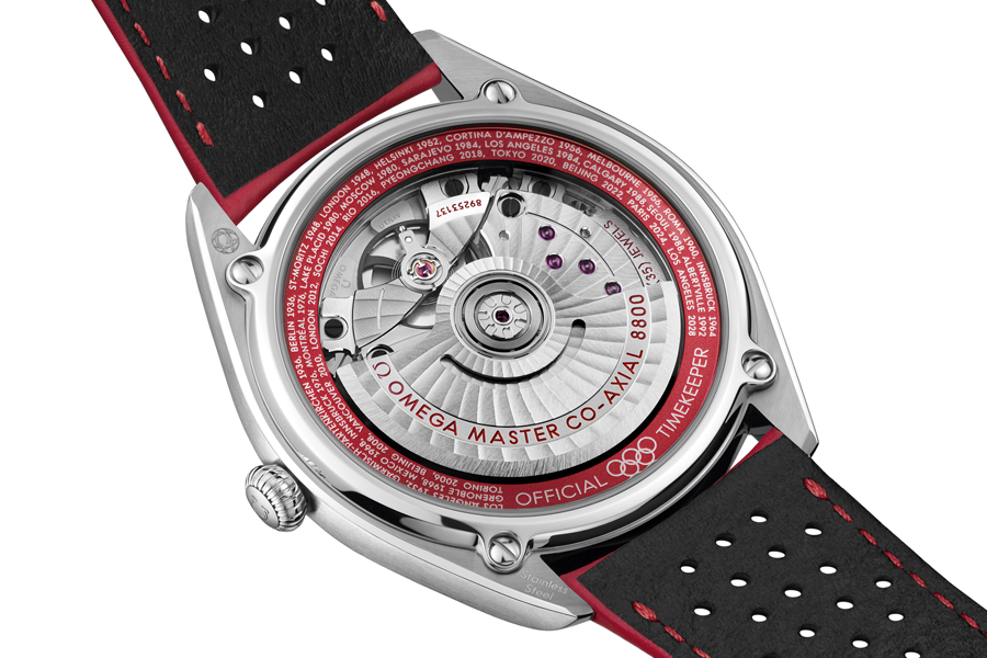 Attraverso il fondello in vetro zaffiro è possibile ammirare il calibro Master Chronometer 8800 con 55 ore di riserva di carica e un anello in alluminio anodizzato che include tutte le città ospitanti conosciute e le date del viaggio Olimpico di Omega, da Los Angeles 1932 fino a Los Angeles 2028.