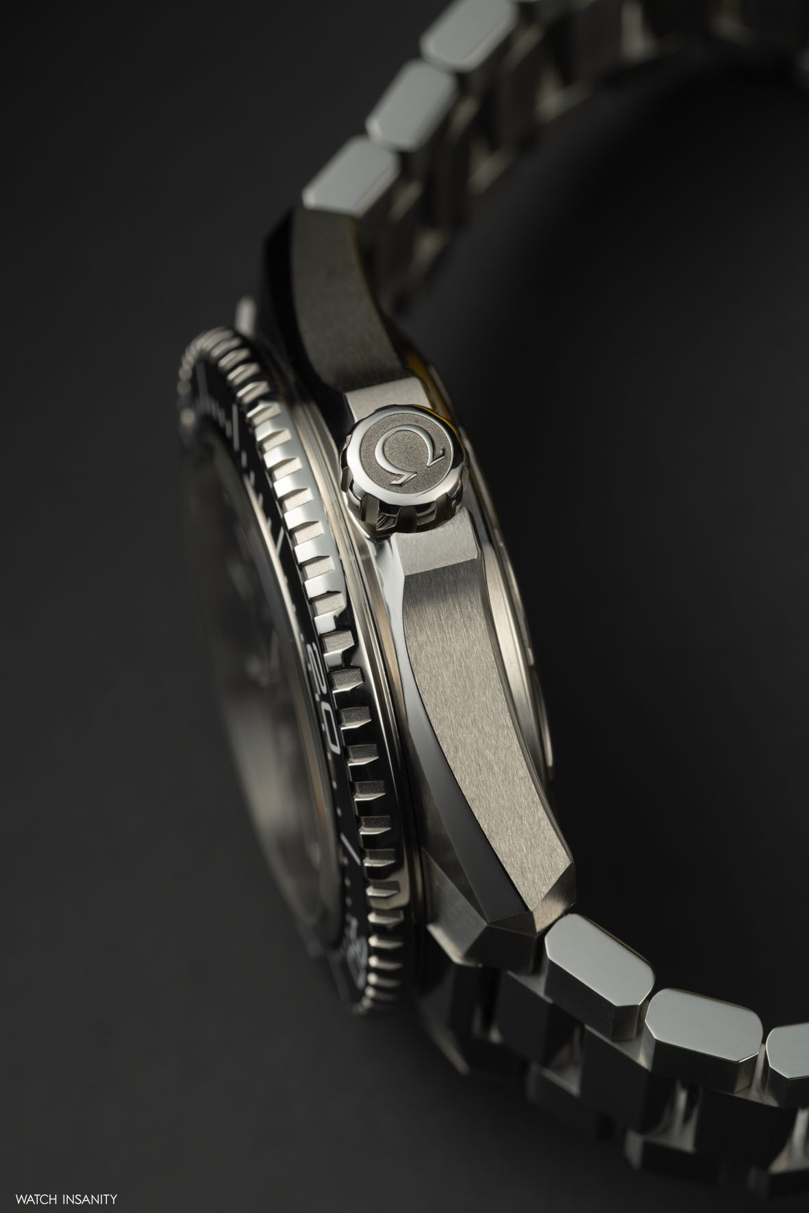 La quarta generazione dei Planet Ocean mostra dunque una struttura della cassa nuova. È composta da due parti, il corpo principale e un anello interno in titanio, per il cui impiego OMEGA ha fatto tesoro del lavoro svolto nel progettare il Planet Ocean Ultra Deep nel 2019. Trattandosi di un modello professionale avanzato, la conoscenza migliorata della tecnologia alla base degli orologi da sub ha portato all’inserimento sul corpo della cassa dell’anello interno in titanio, la cui funzione era quella di fornire la resistenza materiale necessaria per sigillare l’orologio durante le immersioni in profondità.