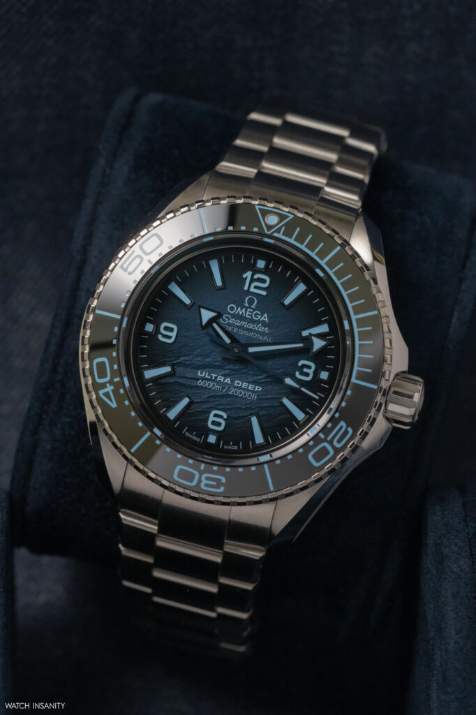 Abbiamo lasciato in fondo la parte più succosa e interessante dell’Ultra Deep 6000M, il quadrante, protetto da un vetro zaffiro bombato, sporgente, resistente ai graffi e con trattamento antiriflesso su entrambi i lati (sintomo di estrema qualità costruttiva). Come abbiamo scritto sopra, l’idea di Omega nel lanciare la collezione Summer Blue è stata quella di declinare il quadrante di ciascun orologio in un blu sempre più scuro a seconda del grado di impermeabilità del segnatempo. Più è impermeabile, più profondo è il colore.