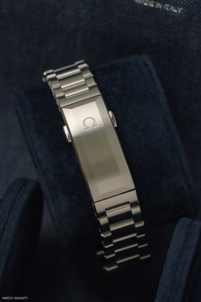 Lavorare con un acciaio con queste caratteristiche, più duro e resistente, significa che è necessario un grande sforzo per tagliarlo, modellarlo e lucidarlo. Questo rende ancora più notevole il lavoro di satinatura e lucidatura che Omega ha fatto sulle anse e sulla carrure, oltre che sulle maglie del bracciale a tre file, anch’esso in O-MEGASTEEL, con fibbia déployante ed estensione subacquea.