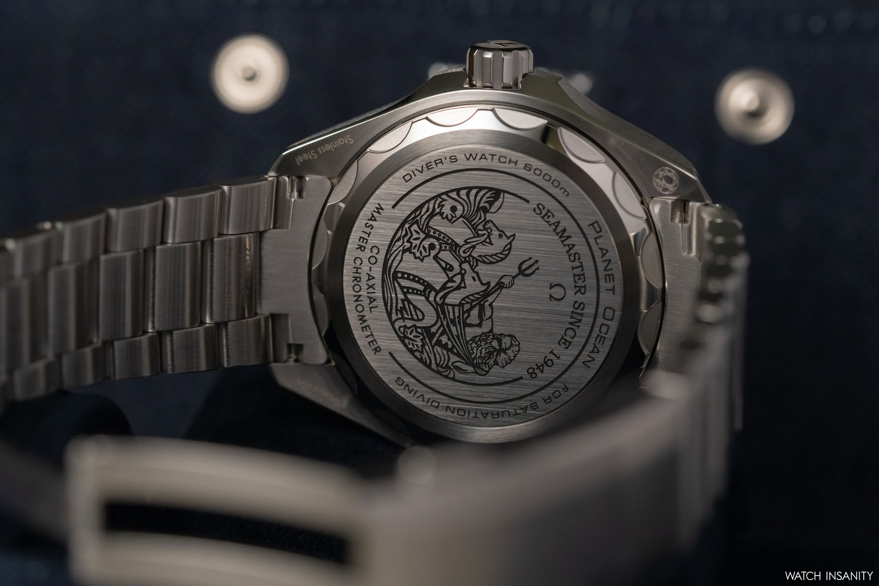 In più, è resistente a campi magnetici fino a 15.000 gauss. Tecnicamente, oltre che per lo scappamento coassiale, si caratterizza per la presenza del bilanciere a spirale libera, senza racchetta, della spirale in silicio e due bariletti montati in serie. Inoltre è rifinito con un motivo a Côtes de Genève arabescato che non è visibile, in quanto il fondello è chiuso. Un fondello commemorativo comune all’intera linea Summer Blue, legato alla storia del Seamaster.