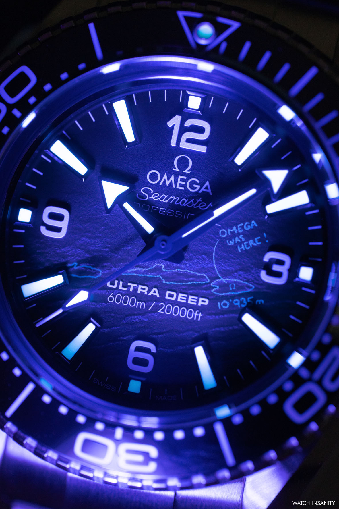 Quello che però fa la differenza è la sorpresa che rivela il quadrante. Se illuminato con un fascio di luce ultravioletta, al centro, nella sua metà inferiore, compaiono stilizzati i disegni dei bacini occidentale, centrale e orientale della Fossa delle Marianne; in corrispondenza di quest’ultimo, la scritta OMEGA WAS HERE!