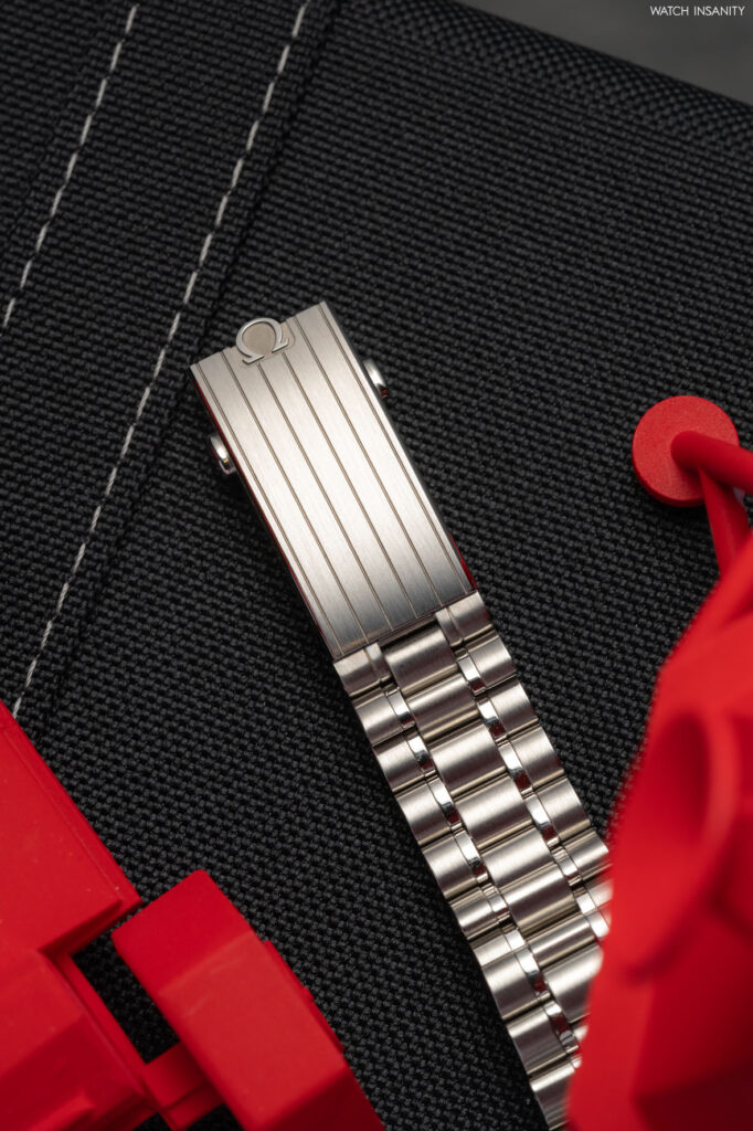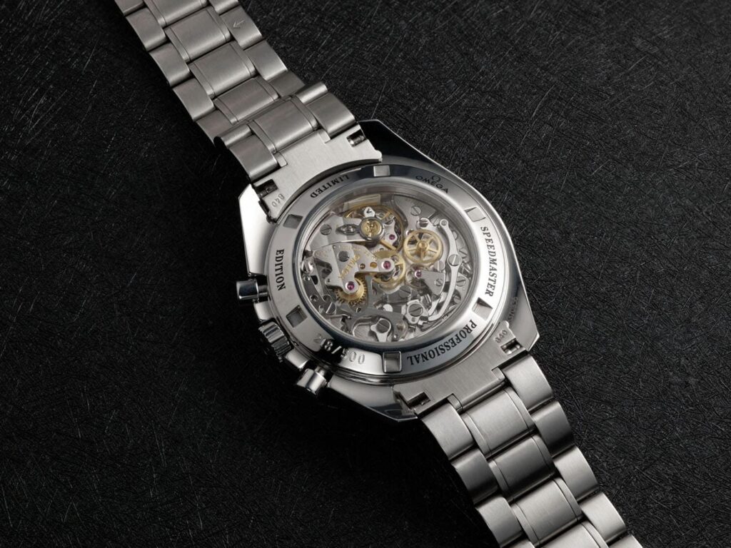 In generale il design di questa referenza si caratterizza per un livello di finitura altissimo che interessa complessivamente tutti i suoi dettagli. A partire dalla cassa da 42 mm, che è in acciaio così come il bracciale d’ispirazione vintage, caratterizzato da un design a cinque maglie incurvate per ciascuna fila. L’estetica classica è completata da una lavorazione che alterna dettagli lucidi e spazzolati. Oltre alla versione con bracciale (che costa 9.100 euro), questo Omega Speedmaster Moonwatch è disponibile anche con un cinturino in pelle nera micro-traforata e impunture bianche in stile racing (8.700 euro) o con cinturino in caucciù con trattamento antibatterico (8.700 euro). Quest’ultimo cinturino è decorato all’interno con un motivo in rilievo positivo che ricorda la superficie lunare, un rimando ulteriormente alla vocazione spaziale dell’orologio.