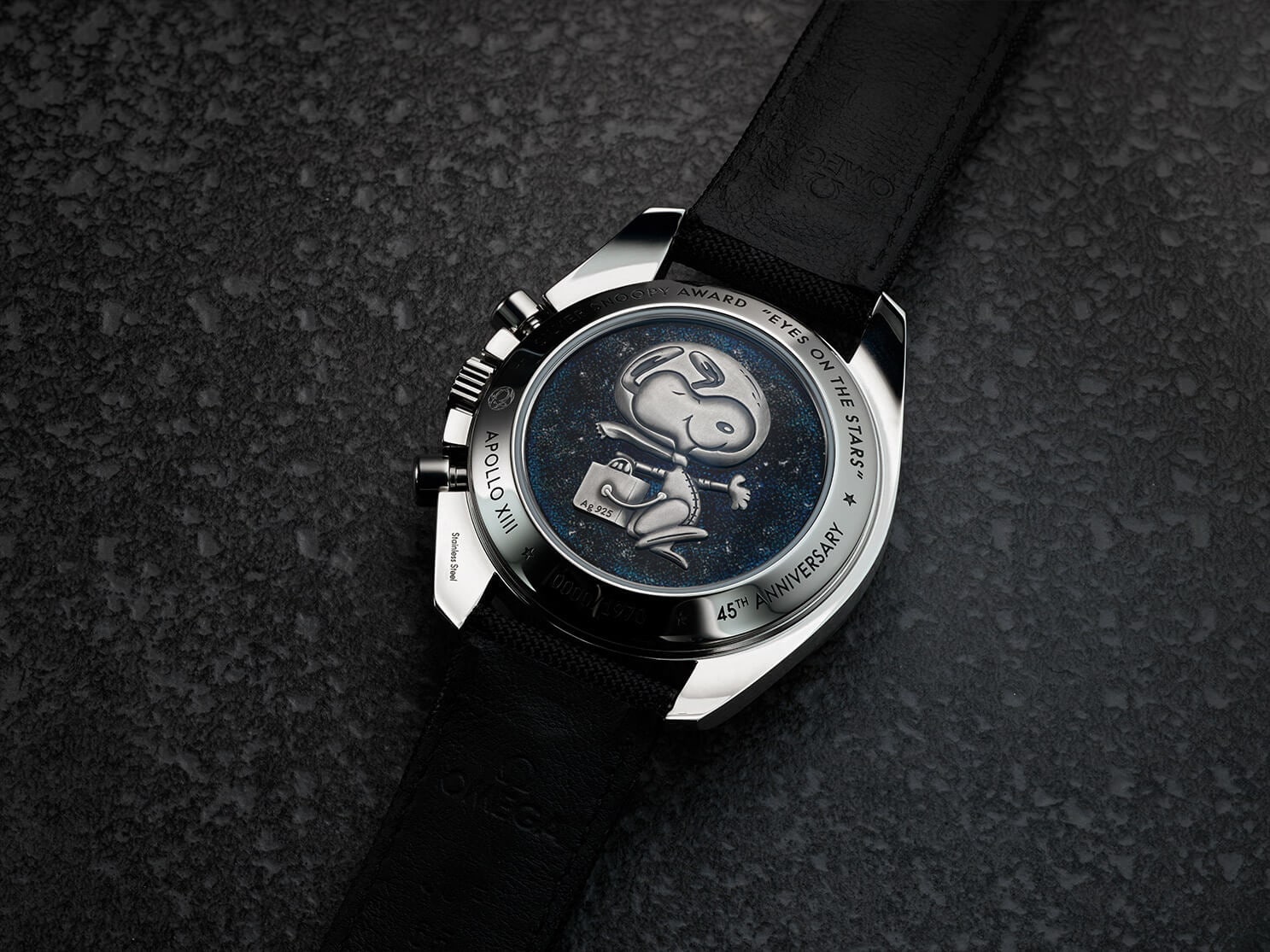 L’Omega Speedmaster Moonwatch del 2015 mostra una combinazione di colori in bianco e nero e diversi dettagli che ricordano quella missione spaziale e quel premio. Il quadrante presenta uno sfondo bianco con scritte e lancette nere, mentre gli indici luminosi hanno un outline bianco con cavità superiori riempite di vernice nera. Il contatore dei piccoli secondi alle 9 mostra Snoopy con un fumetto, «Failure is not an option», «Il fallimento non è un’opzione».