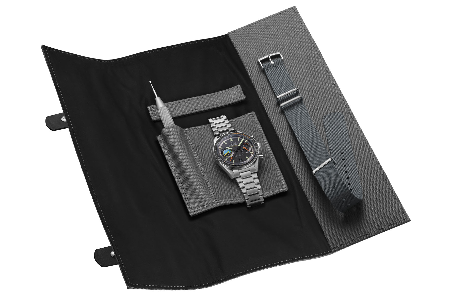 L’orologio può essere indossato con un bracciale in acciaio inossidabile dotato del sistema di regolazione comfort brevettato da OMEGA o, in alternativa, con il cinturino NATO grigio in dotazione, insieme a una speciale custodia da viaggio. Questo cinturino è rinforzato dai fili dell’innovativa fibra KEVLAR e da una fibbia in acciaio inossidabile spazzolato. (Prezzo €. 10,600)