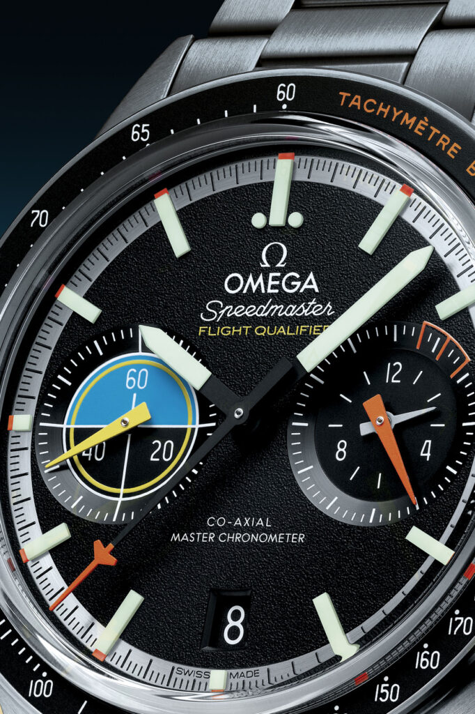 I due contatori gemelli, entrambi opalini al centro e smussati all’esterno, attirano maggiormente l’attenzione. A ore 3, OMEGA ha inserito un contatore di 60 minuti e 12 ore con lancetta triangolare arancione opaco e numeri bianchi trasferiti. Il quadrante è stato progettato per assomigliare all’indicatore del “burn rate” presente nelle cabine di pilotaggio degli aerei.