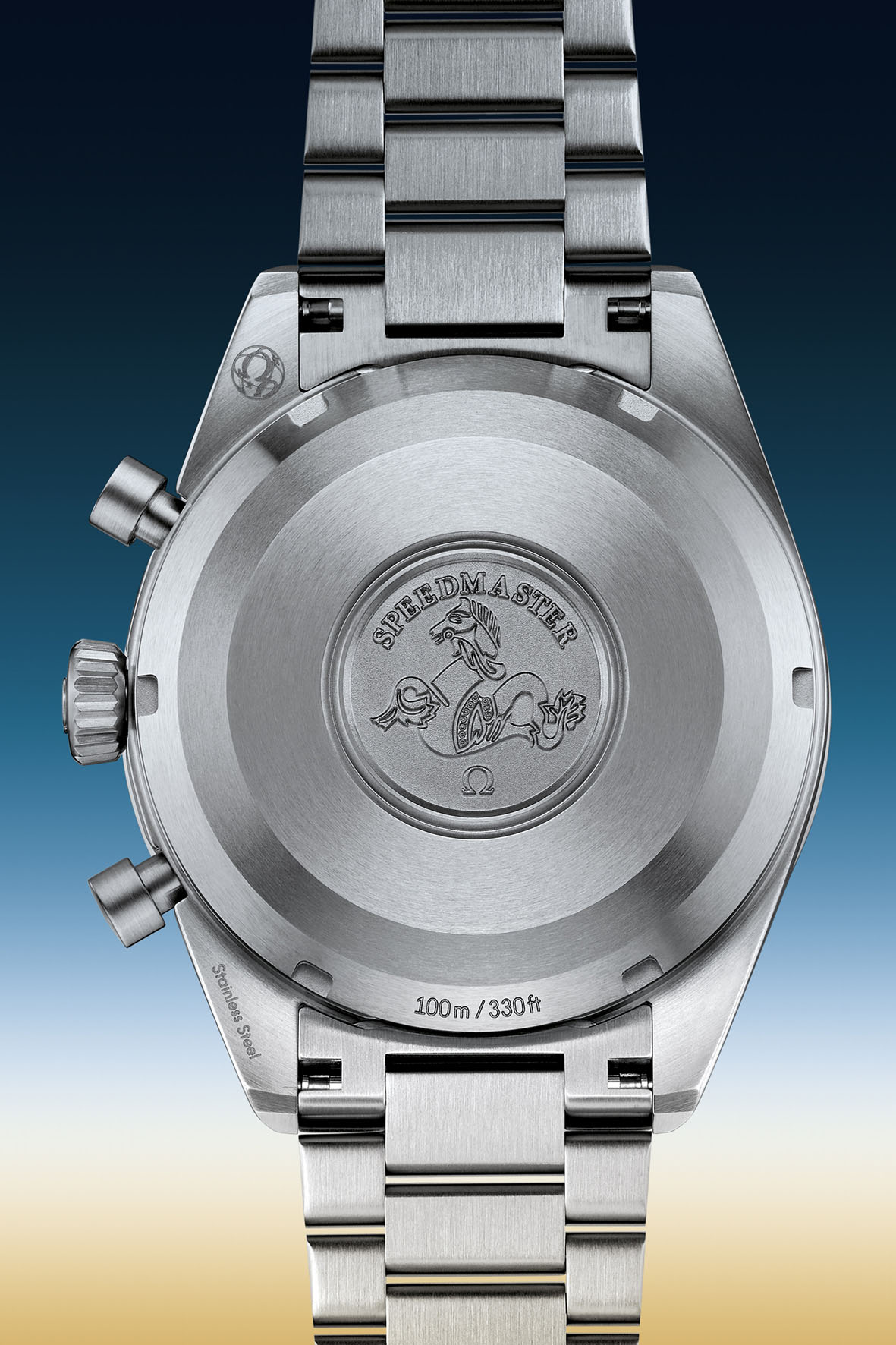 La cassa simmetrica è realizzata in acciaio inossidabile e presenta una finitura opaca per evitare i riflessi. La lunetta è montata su un anello di alluminio opaco e mantiene il suo legame con l’eredità dello Speedmaster attraverso il “Dot Over Ninety” e il “Diagonal to Seventy” sulla scala tachimetrica.
