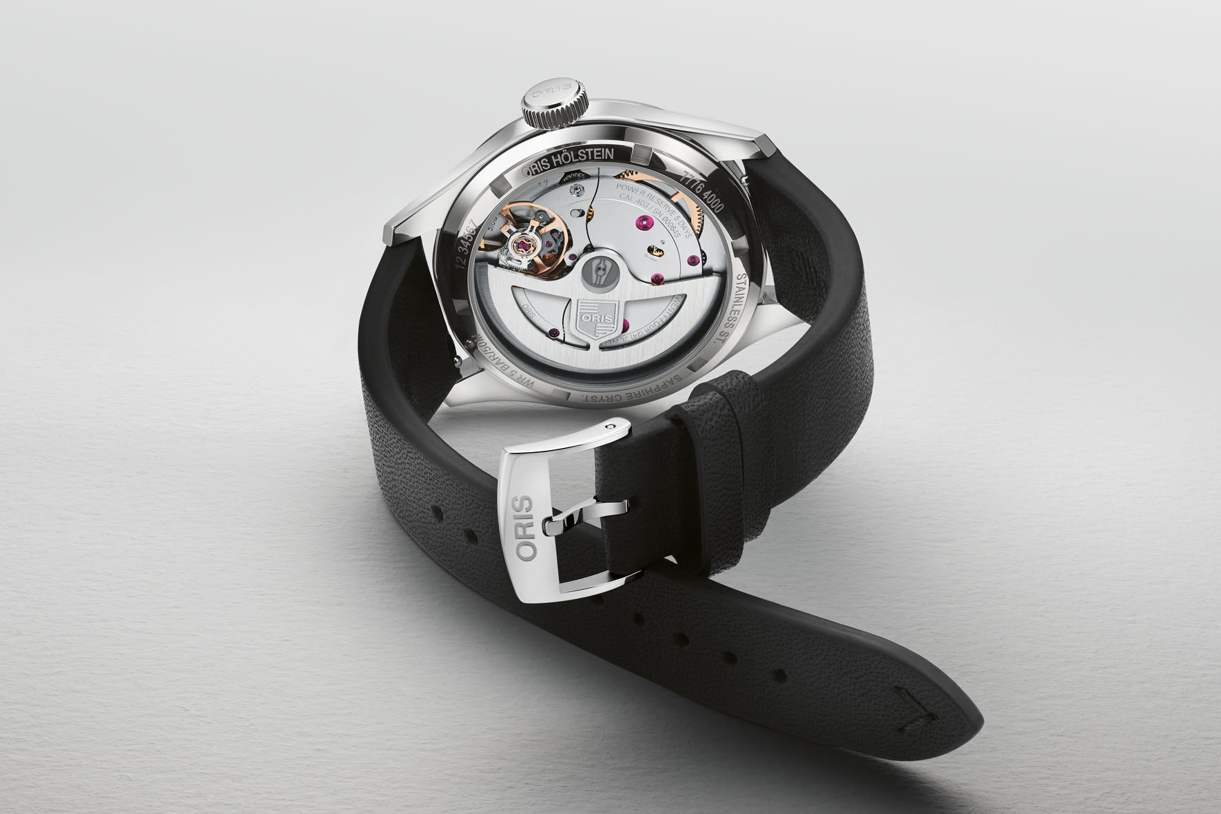 Un investimento così importante in tecnologia non poteva passare inosservato. Da qui la scelta di usare il fondello in vetro zaffiro per rendere visibile il movimento. I ponti sono lisci, non hanno finiture a Côtes de Genève o simili; l’unico vezzo è il blasone di Oris sulla massa oscillante. Il fatto però che il calibro misuri 30 mm di diametro e la cassa 38, fa sì che l’anello di incassaggio sia molto sottile e lasci il movimento ben visibile, dando all’orologio un percepito molto alto.