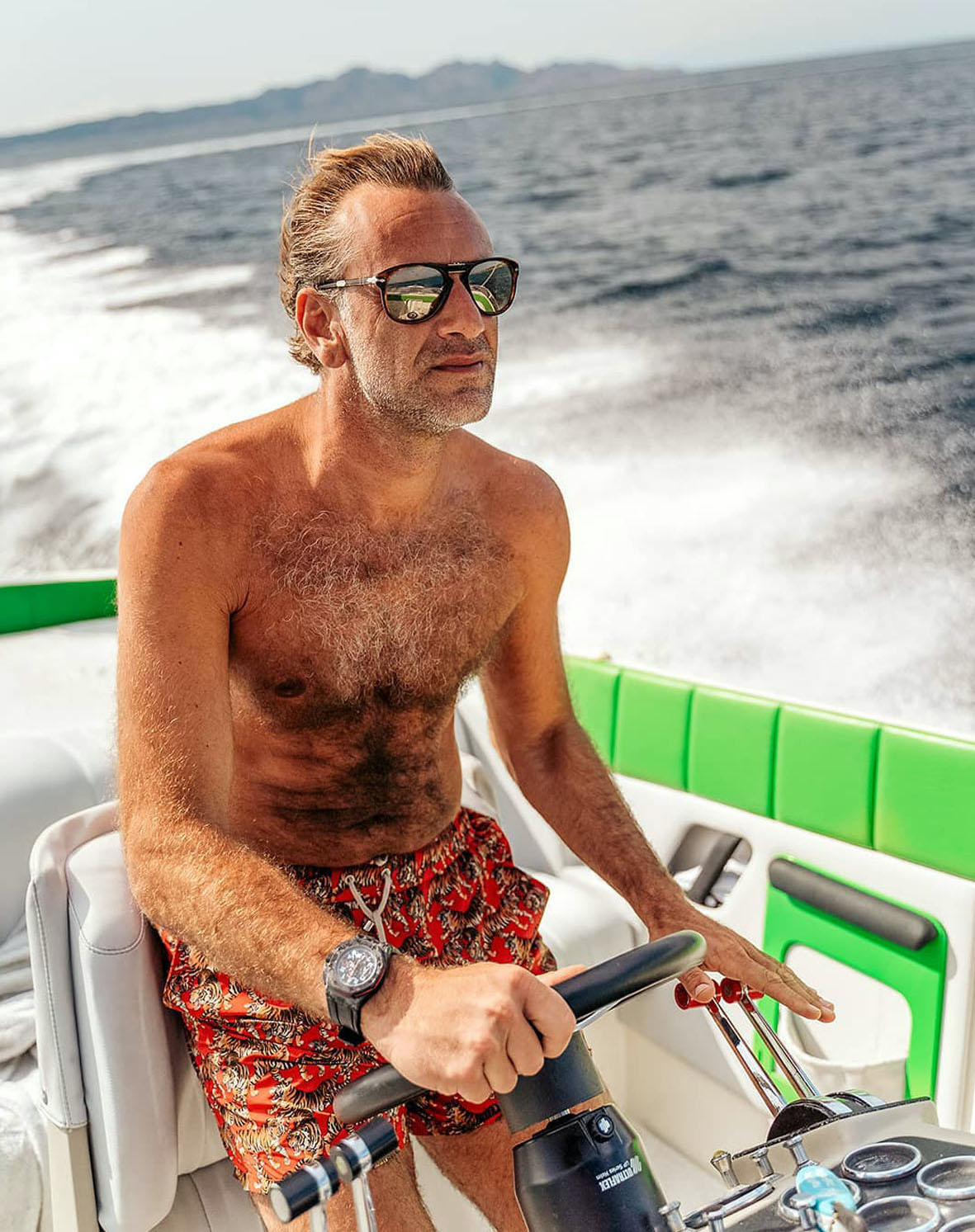 Cerco sempre orologi puliti e minimali, anche se possiedo un Rolex Submariner Serti dial con diamanti, che però nemmeno si vedono. È una questione di bilanciamento, uno sportivo-elegante è più indossabile. D’estate sono sempre al mare, per cui indosso solo sportivi, anche se amo un orologio come l’Octo Finissimo di Bulgari. Oltre a questi due ne ho vari, tra cui un Audemars Piguet Royal Oak Offshore carbon Alinghi che mi piace da morire ed è molto pratico per la vita che faccio qui. Se 10 anni fa cambiavo l’orologio quasi ogni giorno, ora ne tengo solo pochi che uso tutto l’anno e poi magari l’anno successivo li cambio con un altro set.