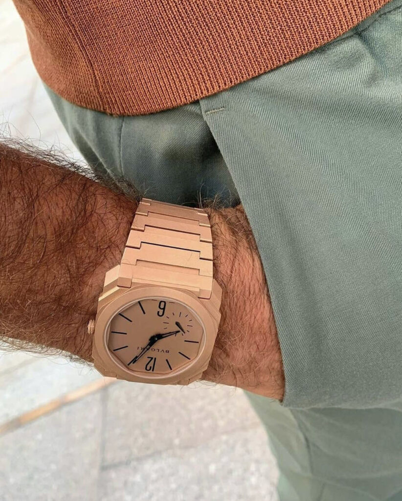 Trovo belli l’Aquanaut con quadrante verde e l’Octo Finissimo in oro rosa satinato.