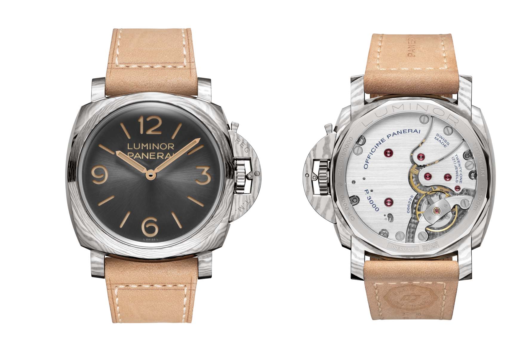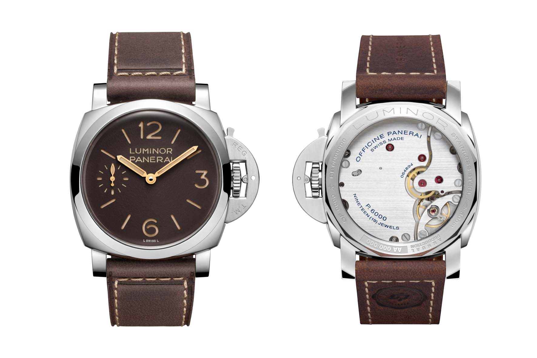 La cassa in acciaio da 44 mm mantiene la stessa architettura della versione PAM01731, con middle case a cuscino, alternanza di superfici lucide e satinate e vetro zaffiro bombato, mentre il fondello trasparente consente di osservare il calibro P.6000 a carica manuale, identico per costruzione e prestazioni.