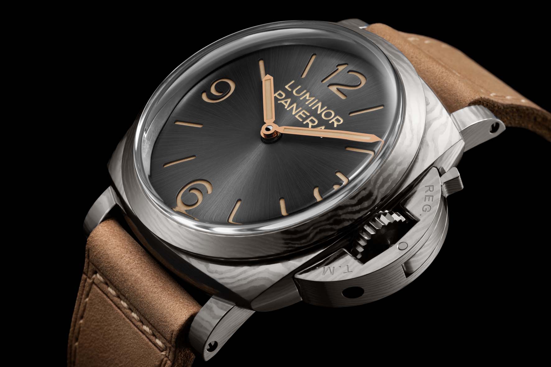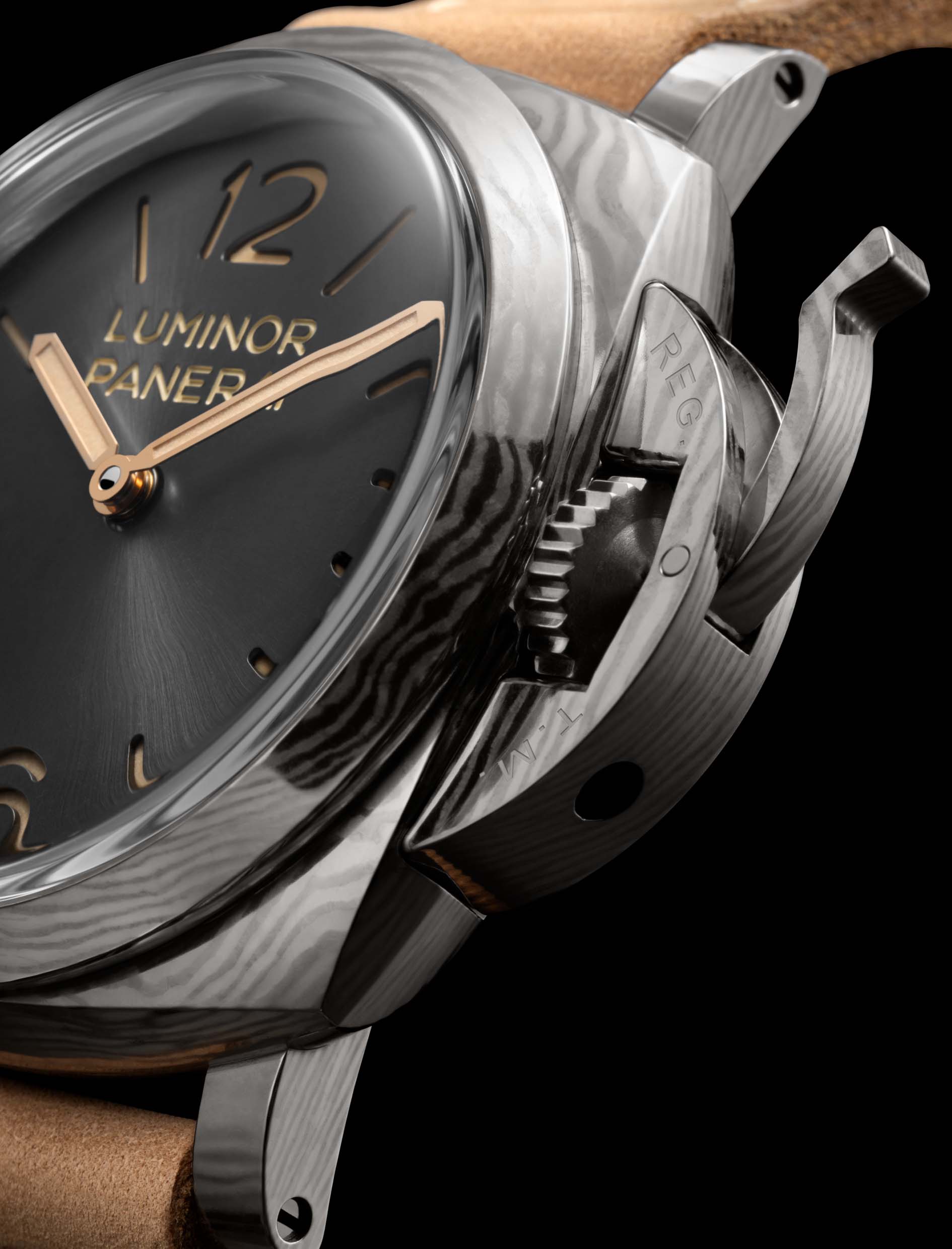 Se il Luminor PAM01735 rappresenta un ritorno diretto alle origini, il Luminor Forged Titanium PAM01629 sviluppa la stessa architettura introducendo una variazione sostanziale sul piano dei materiali. Per la prima volta, Panerai utilizza il forged titanium, un materiale ottenuto attraverso la combinazione di due diverse leghe di titanio sottoposte a pressione e calore in un processo di forgiatura che consente di ottenere una struttura compatta e resistente. Il risultato è una superficie caratterizzata da un pattern ondulato di tonalità grigie, che varia da un esemplare all’altro rendendo ogni cassa unica.
