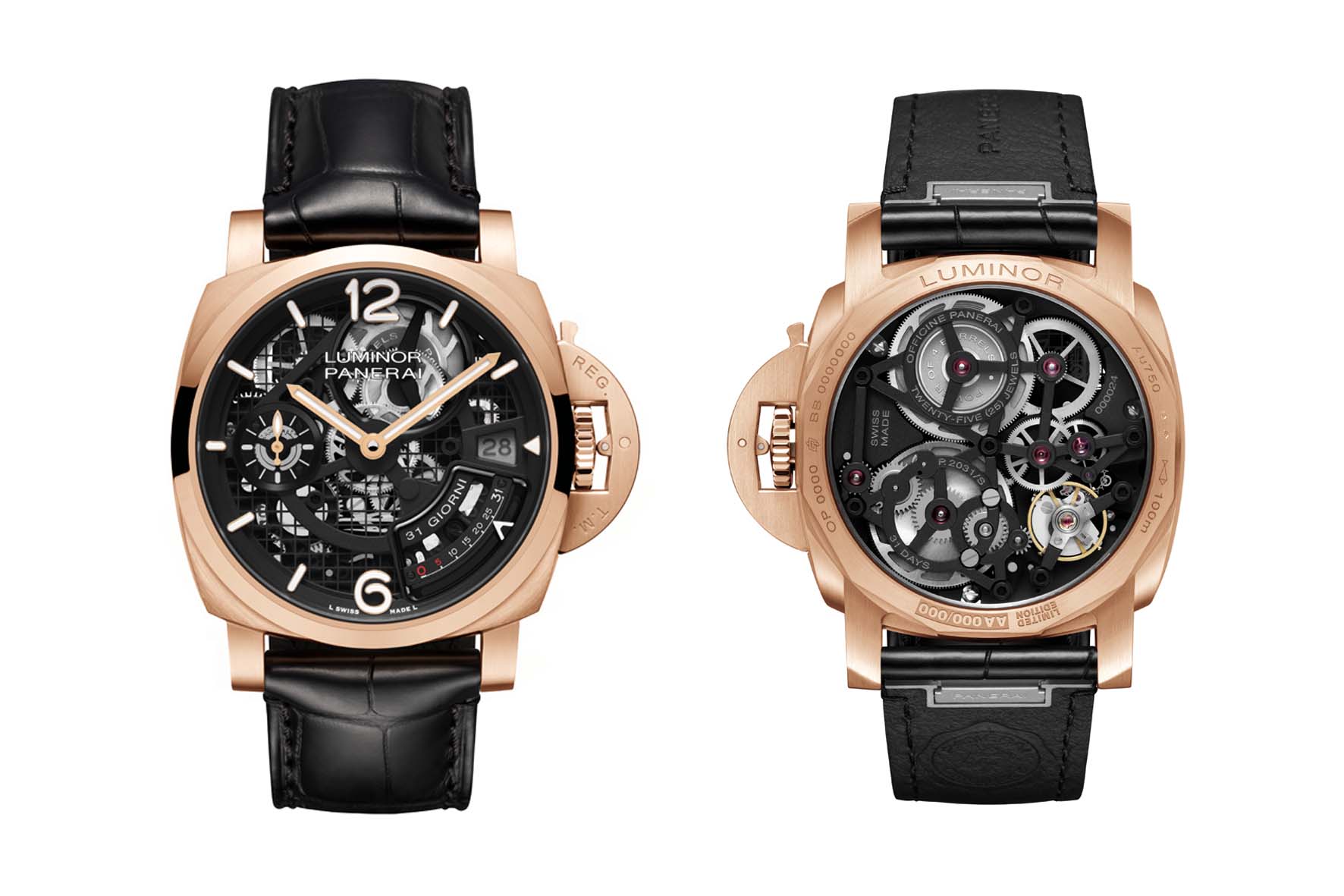 Il modello è sviluppato nell’arco di sette anni dal Laboratorio di Idee e racchiuso in una cassa da 44 mm in Panerai Goldtech, una lega a base di oro e rame con aggiunta di platino e argento che migliora la stabilità cromatica e la resistenza all’ossidazione. All’interno, il calibro P.2031/S a carica manuale adotta un’architettura completamente scheletrata costruita attorno a quattro bariletti montati in serie. Questo sistema utilizza molle per un totale di circa 3,3 metri di lunghezza, progettate per lavorare a bassa coppia e con rotazione più rapida, riducendo attriti e sollecitazioni sui pivot e consentendo una distribuzione dell’energia più regolare lungo l’intero ciclo di funzionamento. Il risultato è un’autonomia di 31 giorni, pari a 744 ore, ottenuta con soli 128 giri di corona, senza la necessità di sistemi di carica dedicati o strumenti esterni.