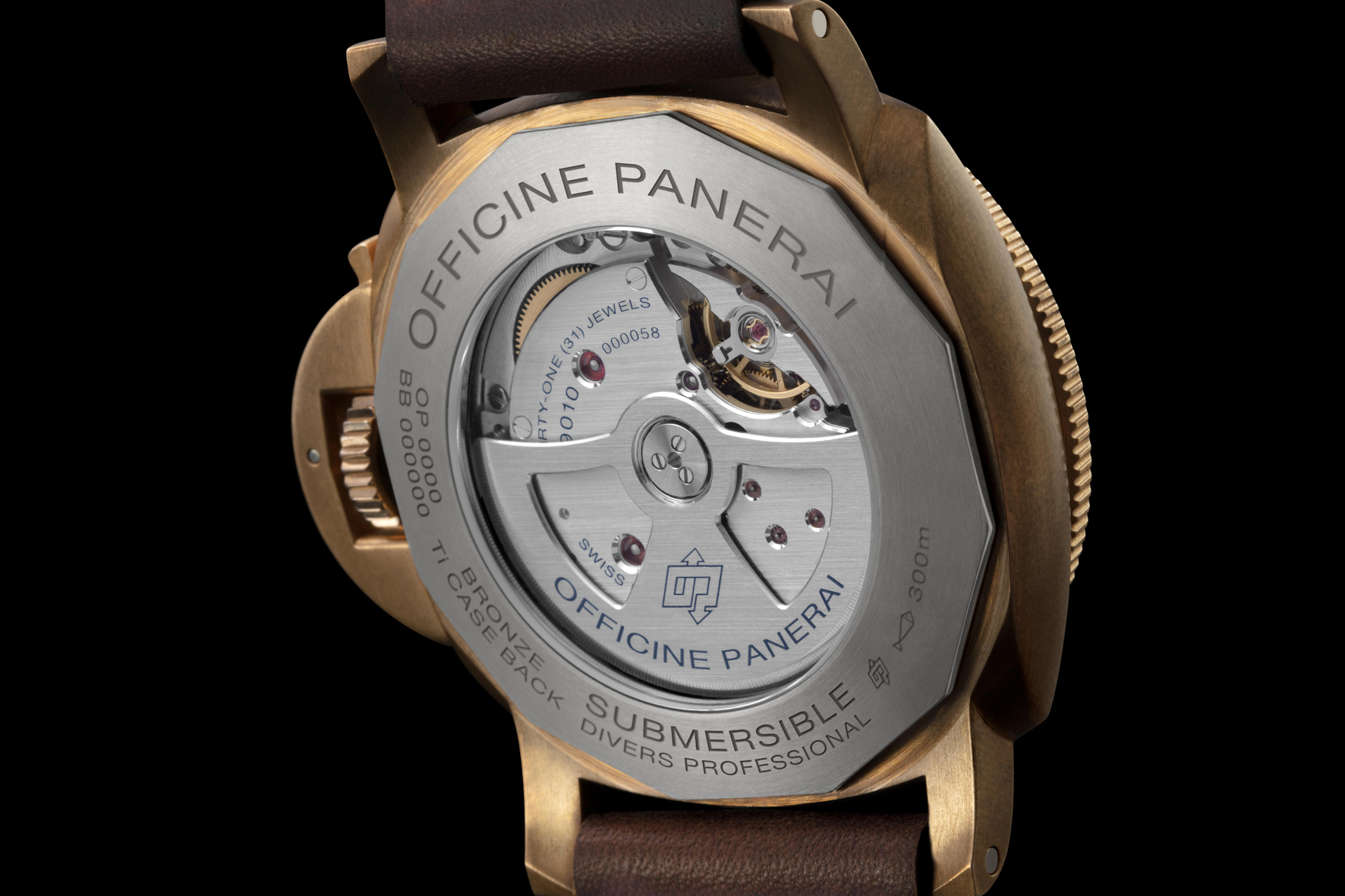 La sua massiccia cassa di 47mm in bronzo presenta il classico dispositivo di protezione della corona di carica brevettato da Panerai nel 1955 realizzato qui in bronzo satinato. In questa nuova versione, sulla lunetta girevole è applicato un disco in ceramica marrone microsabbiata, che si integra con il colore del quadrante e del cinturino in pelle naturale tagliata a vivo, marroni anch’essi. Oltre ad avere la funzione di proteggere l’orologio da un’eccessiva ossidazione senza alterarne le proprietà, la patina che si forma gradualmente sulla superficie in bronzo conferisce un aspetto vissuto e originale a ogni esemplare.