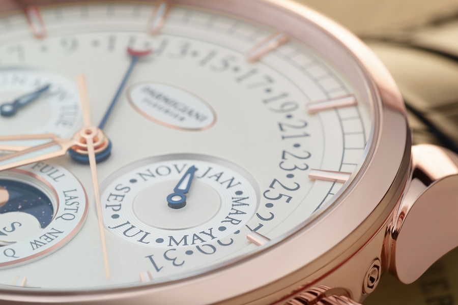 Il Tonda Calendario Annuale è caratterizzato da un quadrante più ampio “grazie all’apertura della lunetta” costruito su più livelli per conferire maggiore tridimensionalità e precisione di lettura. La minuteria e gli indici sono esterni alle cifre della data retrograda che incorniciano il contatore dei giorni a ore 9 e quello dei mesi a ore 3.