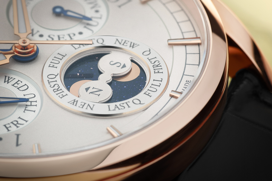 Il contatore delle fasi lunari a ore 6 completa le indicazioni del calendario. Questa complicazione è chiamata “di precisione” in quanto richiede una sola correzione ogni 122 anni. Sono presenti due rappresentazioni della Luna; vista dall’emisfero nord e dall’emisfero sud della Terra, in modo da corrispondere alla posizione geografica esatta del proprietario dell’orologio. Le lune sono raffigurate in oro rosa su un cielo di vetro avventurina.