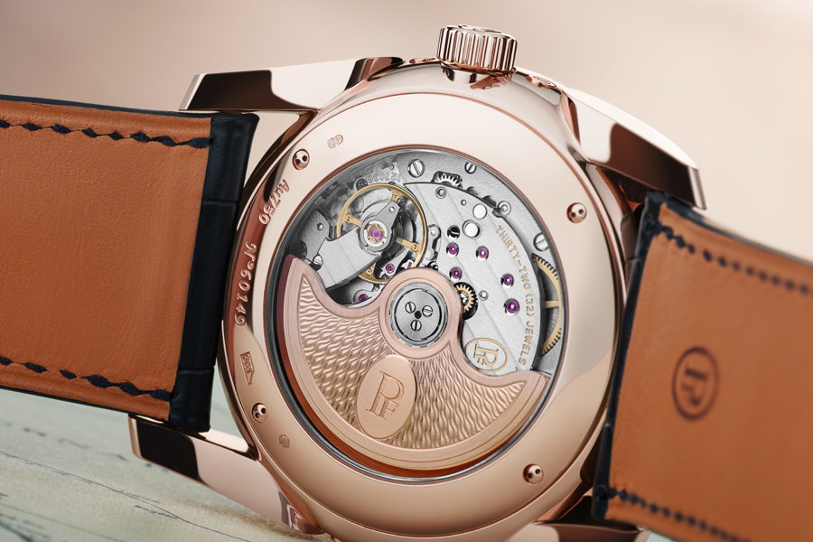 Per questo orologio, sulla base del movimento automatico PF331 Parmigiani Fleurier ha sviluppato il calibro PF339 con 50 ore di riserva di carica e un doppio bariletto montato in serie. Questo consente di stabilizzare la distribuzione dell’energia in modo da trasmetterla al regolatore a livello costante. Il movimento è decorato con anglage a mano e decorazione Côtes de Genève sui ponti e una massa oscillante in oro rosa massiccio, decorata con un guilloché grain d’orge.