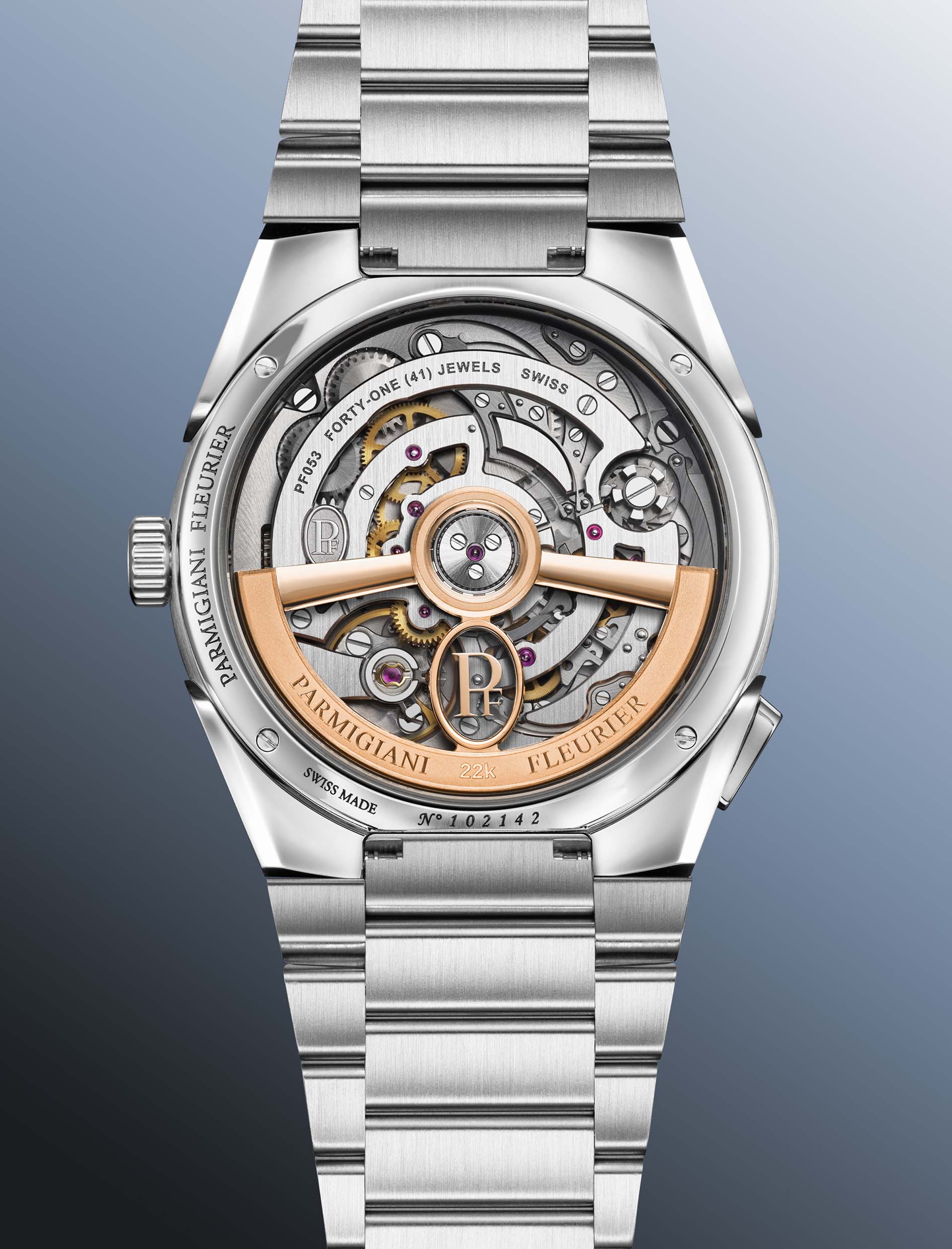 Anche le finiture sono all’altezza della visione: ponti satinati e smussati a mano, massa oscillante scheletrata in oro rosa 22 carati lucido e sabbiato, e quell’equilibrio tra rigore tecnico ed esecuzione artigianale che definisce l’identità di Parmigiani Fleurier.