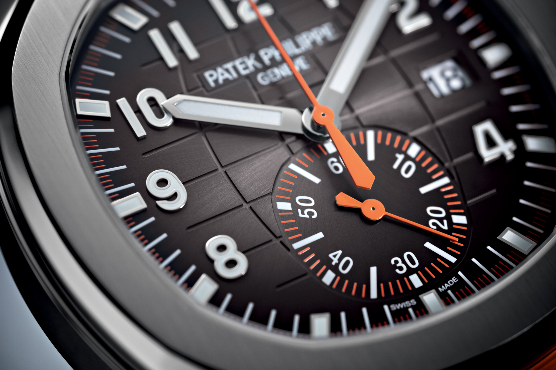 La nuova Ref. 5968A-001 in acciaio sorprende anche per la sua estetica fuori dal comune, dove il cronografo è integrato al design esclusivo Aquanaut. Il contatore 60 minuti a ore 6 riprende la forma caratteristica dell’ottagono addolcito della lunetta. I pulsanti allungati s’inseriscono con grande equilibrio da un lato e dall’altro delle spallette di protezione della corona. Le indicazioni del cronografo arancio (lancetta centrale dei secondi, chemin de fer che indica il quarto di secondo alla periferia del quadrante, lancetta e scala del contatore 60 minuti) si stagliano sullo sfondo nero caratterizzato dal rilievo strutturato tipico della collezione. La leggibilità è garantita dalle cifre arabe applicate in oro con rivestimento luminescente e dalle grandi lancette a bastone, anch’esse luminescenti.