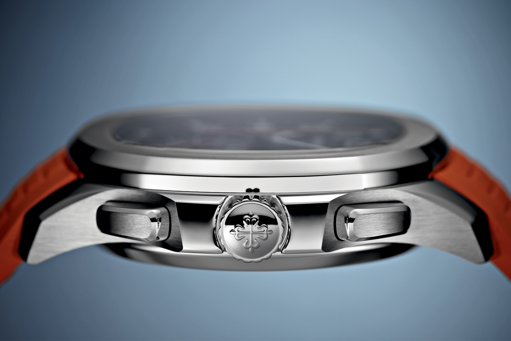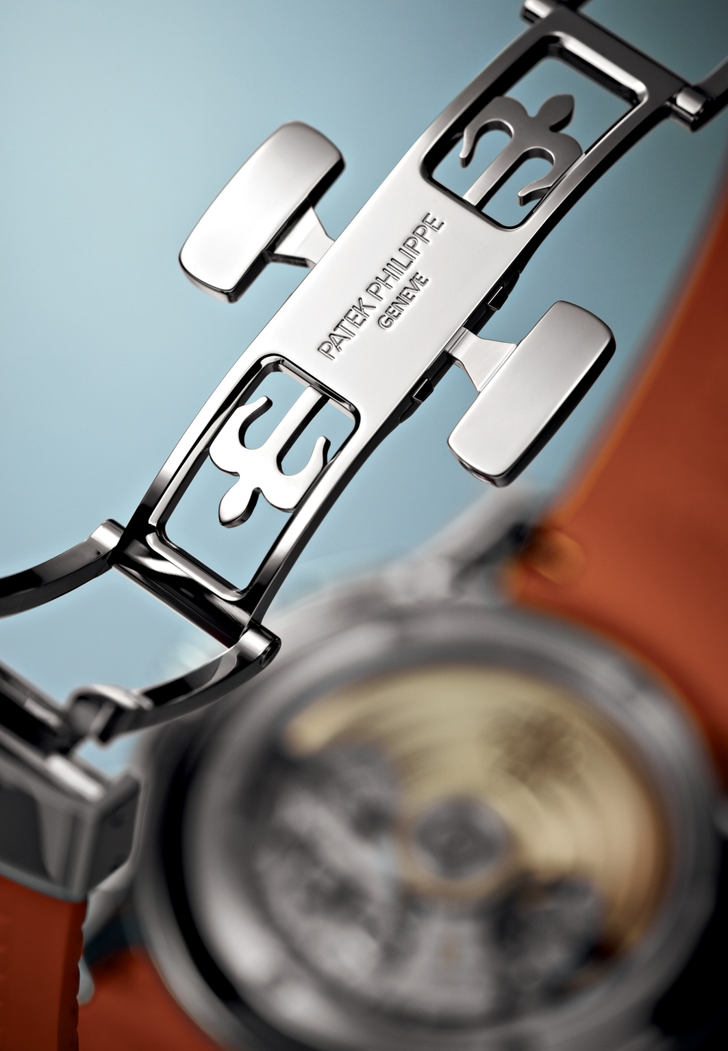 Il cinturino in materiale composito, impreziosito da un rilievo che ricorda quello del quadrante, si distingue per la sua comodità al polso e per l’elevata resistenza alla trazione, all’usura, all’acqua salata e ai raggi ultravioletti. Patek Philippe consegna questo modello unitamente a due cinturini, il primo nero su cui è montato l’orologio e il secondo arancio, a sottolineare la nota audace del quadrante.