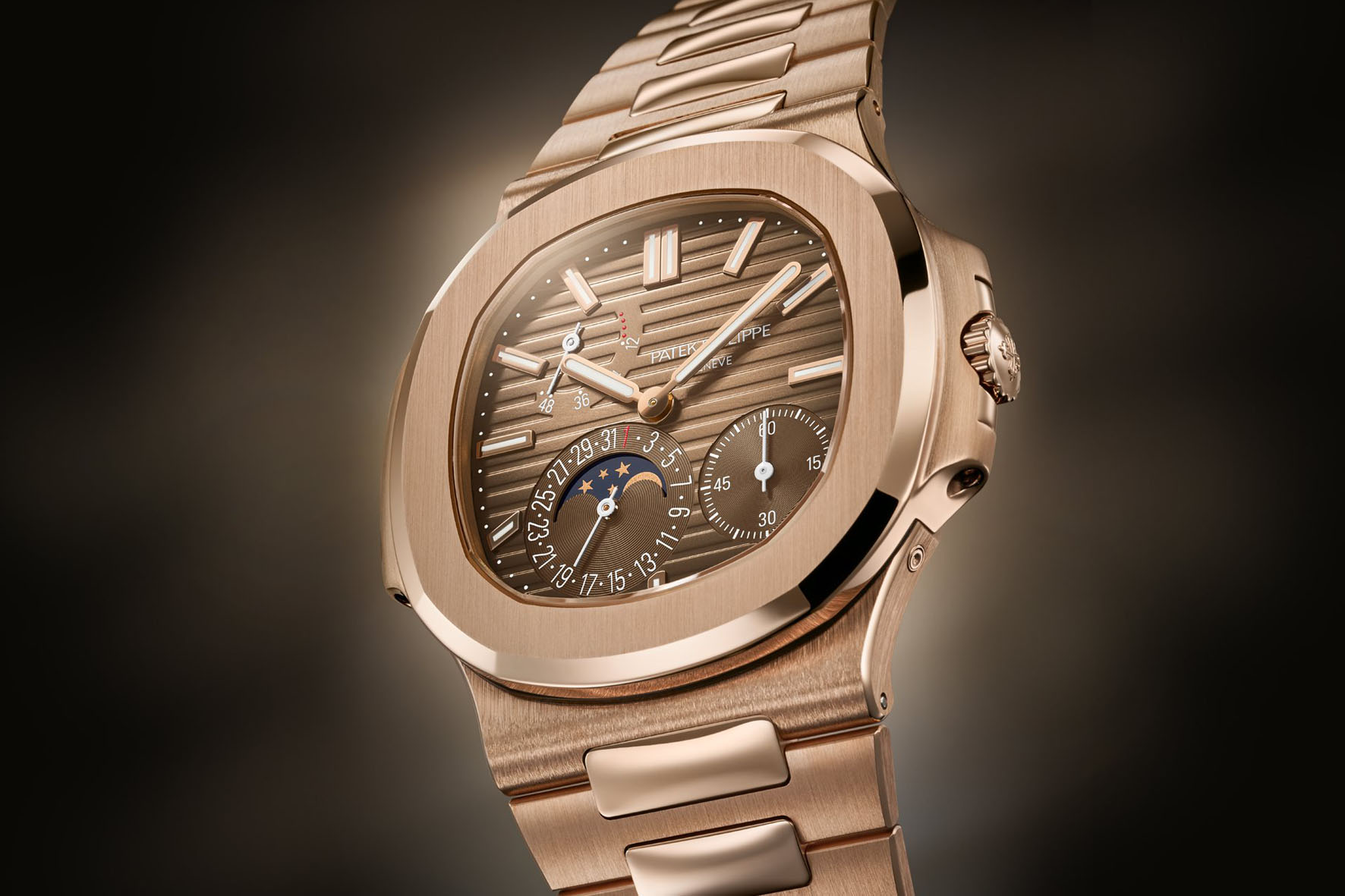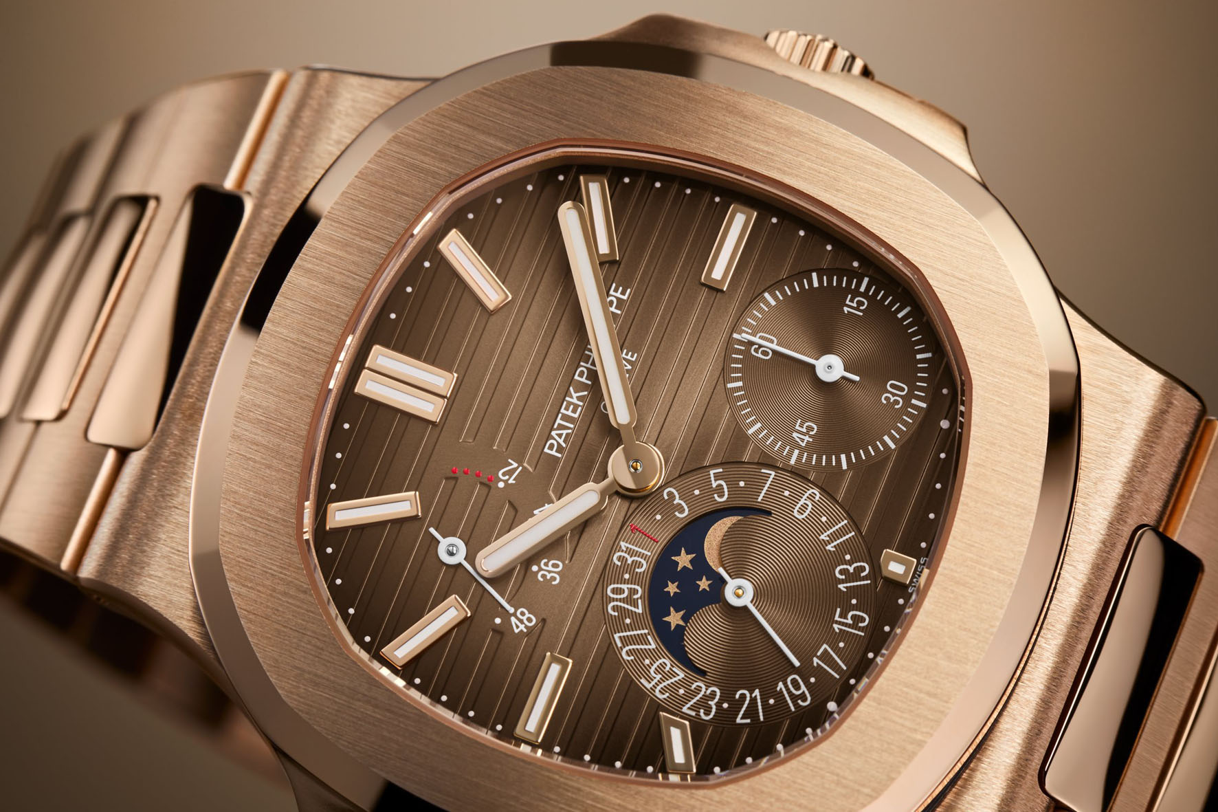 Il Nautilus con datario a lancetta, fasi lunari e indicatore della riserva di carica, Ref. 5712/1R-001 (calibro 240 PS IRM C LU ultrapiatto a carica automatica) è reinterpretato in una nuova versione che abbina cassa e bracciale in oro rosa e quadrante bruno soleil sfumato nero sul bordo. Sul quadrante sono visualizzate le tre complicazioni in una disposizione originale e perfettamente leggibile. La cassa impermeabile fino a 60 metri, la lunetta ottagonale e il comodo bracciale integrato sono impreziositi da un elegante contrasto di finiture lucide e satinate, tutte realizzate a mano. (Prezzo €.83,470)