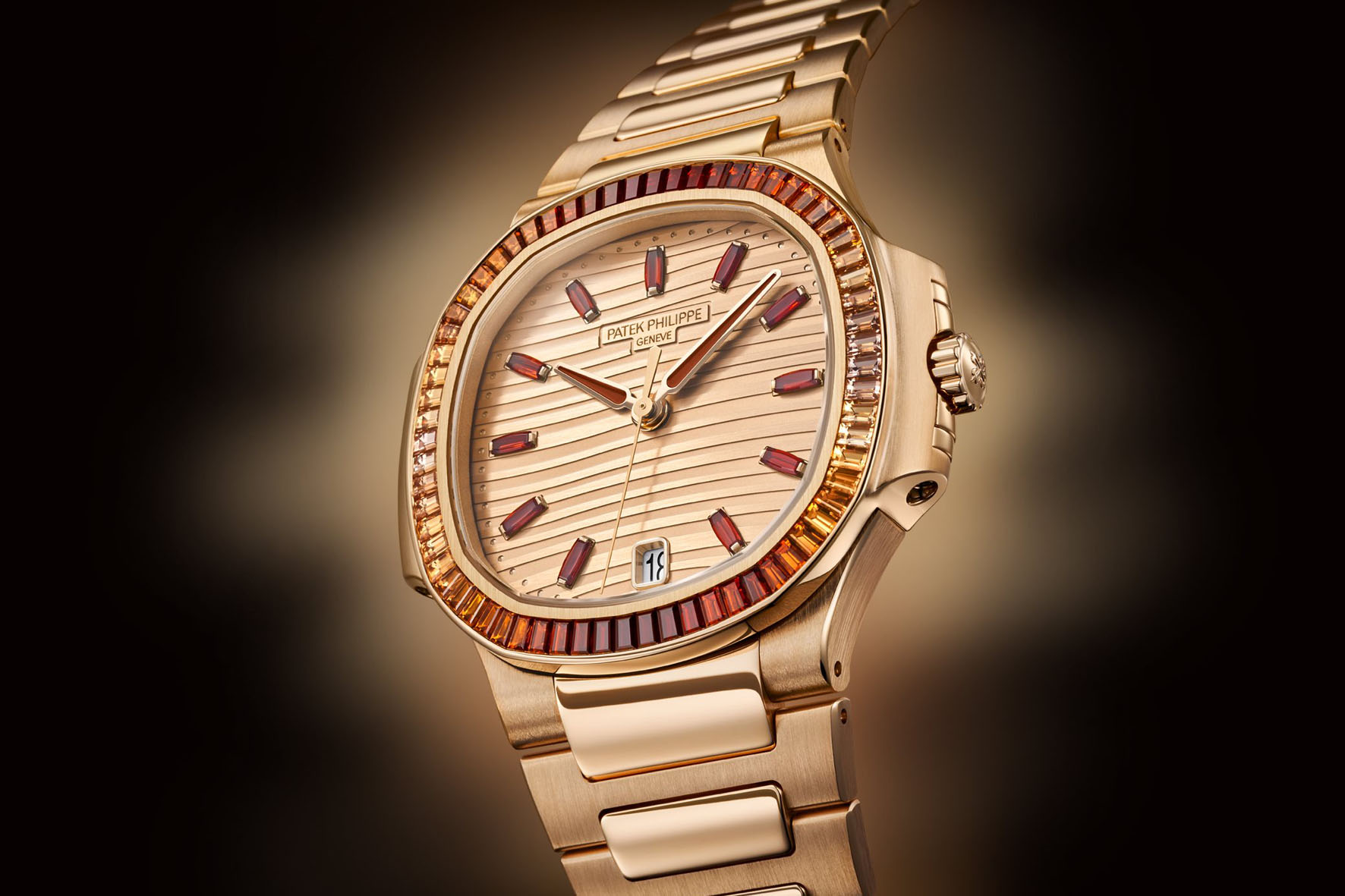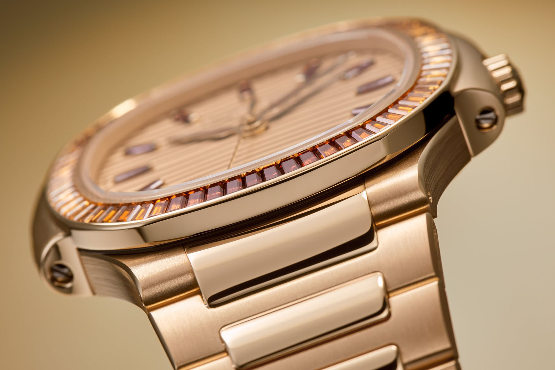 Il Nautilus Ladies è declinato in una nuova versione gioiello in cui i riflessi dell’oro rosa creano un armonioso abbinamento con le sfumature calde della spessartite. Questo Nautilus Joaillerie, Ref. 7118/1300R-001 si distingue per la lunetta su cui scintillano 68 pietre taglio baguette che compongono una doppia sfumatura che va dai toni cognac a ore 12 e a ore 6 alle tonalità champagne a ore 9 e a ore 3. Un tocco di dinamismo che conferisce a questa creazione uno stile decisamente moderno. Il quadrante completa l’armonia cromatica con gli undici indici di spessartite cognac incastonati, a forma di “ogiva”. Il calibro 324 S C a carica automatica, con le sue raffinate finiture, è visibile attraverso il fondo cassa in cristallo di zaffiro trasparente. Il bracciale è dotato di un fermaglio déployant Patek Philippe reso sicuro da quattro punti di attacco indipendenti. (Prezzo €. 83,470)