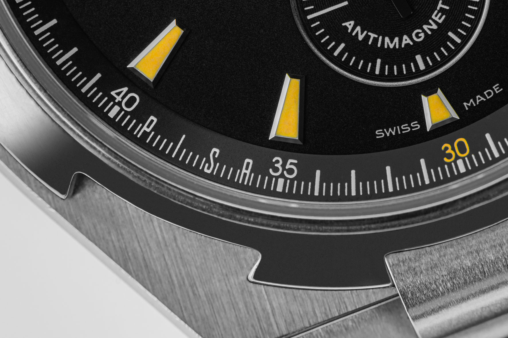 Il quadrante racchiude tutta la personalizzazione messa a punto da Vacheron Constantin con Pisa Orologeria: il fondo è nero opaco senza lavorazioni guilloché, i contatori sono bianchi, gli indici, le lancette e le cifre 15, 30 e 45 sul rehaut sono rivestite da un materiale luminescente che ha un colore giallo pallidoinedito ed esclusivo.