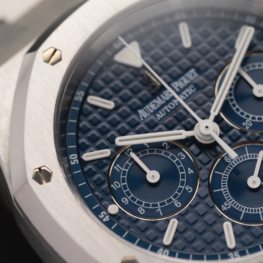 Il quadrante presenta il tipico motivo “Grande Tapisserie”, un elemento distintivo della collezione Royal Oak. Gli indici applicati e le lancette sono in oro bianco con rivestimento luminescente. La configurazione del cronografo include tre contatori: il contatore dei 30 minuti a ore 3, quello delle 12 ore a ore 6 e i piccoli secondi a ore 9. La finestra e la relativa indicazione della data sono invece posizionate tra le ore 4 e le 5