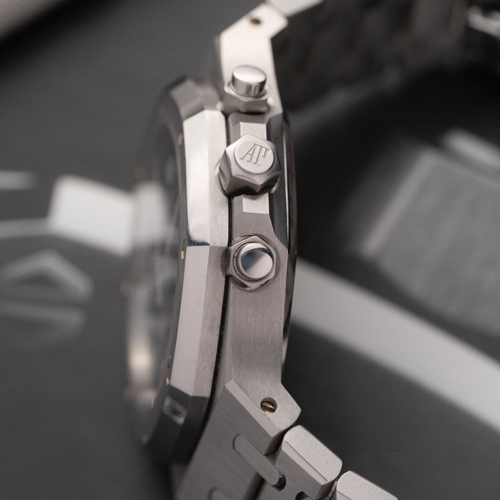 La cassa è in acciaio inossidabile e misura 39 mm (con uno spessore di circa 11 mm), una dimensione fedele al design originale del Royal Oak. Presenta la caratteristica lunetta ottagonale fissata da otto viti esagonali e la superficie alterna finiture lucide e satinate, con un’attenzione meticolosa all’alternanza tra le superfici spazzolate e i bordi smussati lucidi. La corona e i pulsanti del cronografo a vite sono anch’essi in acciaio e si integrano alla perfezione garantendo un’impermeabilità di 50 metri. L’orologio è completato da un bracciale integrato in acciaio con maglie satinate e chiusura a scomparsa.