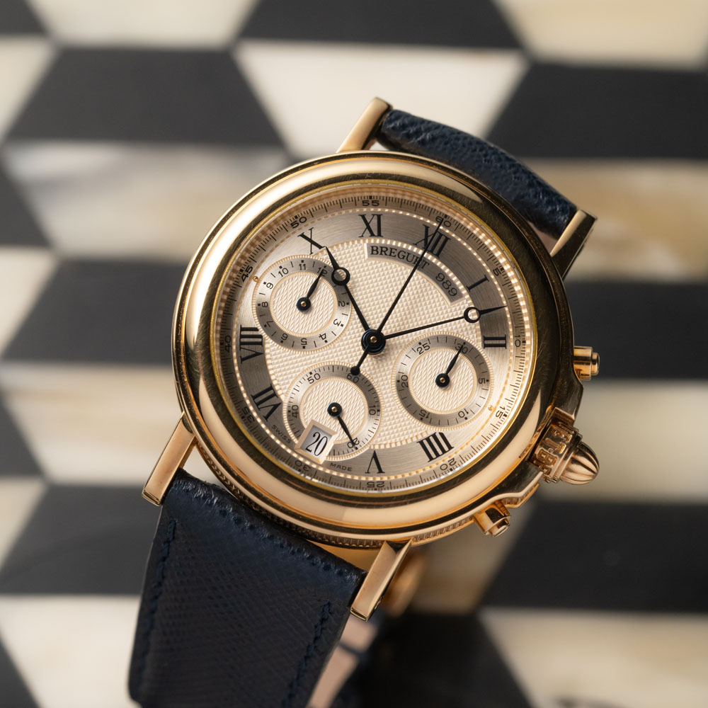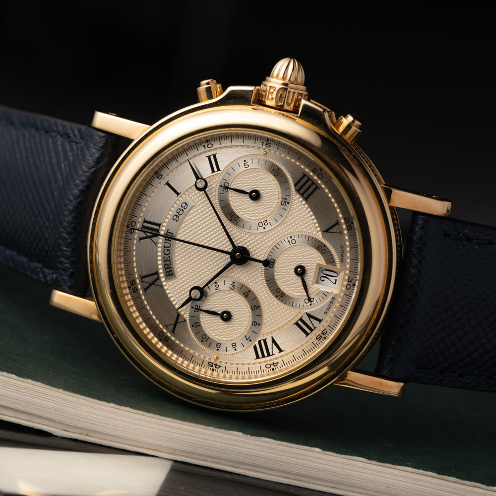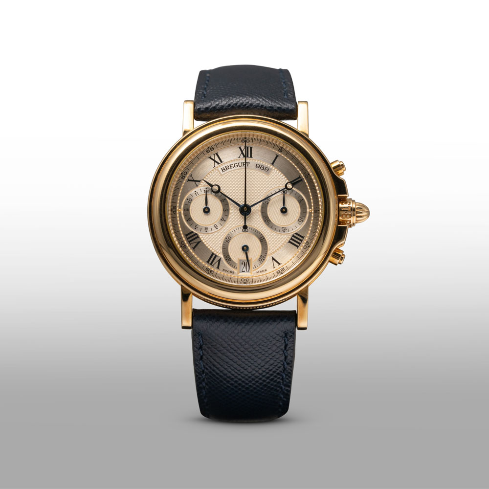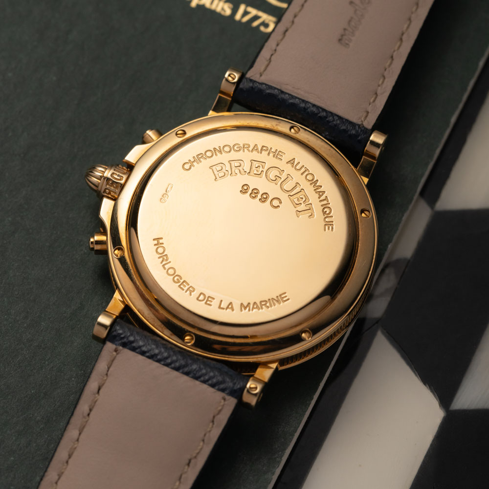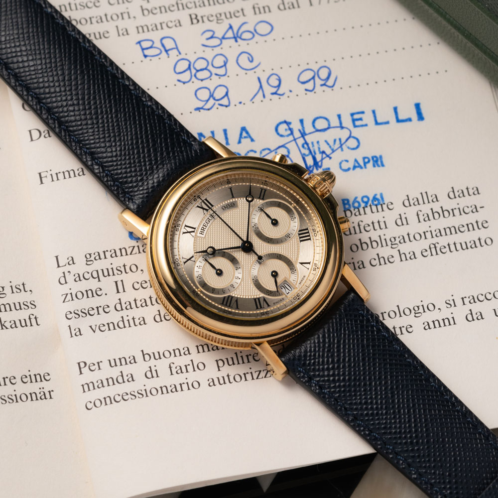 La storia della collezione Breguet Marine ha origini lontane, poiché il suo nome deriva dal titolo di “horloger de la Marine Royale” di cui Abraham-Louis Breguet fu insignito nel 1815. Nel 1990, la Maison si collegò a questa storia per presentare la collezione Marine, ispirata all’aspetto classico e alla grandezza tecnica dei cronometri da marina. La linea, rinfrescata nel 2018, è tuttora uno dei pilastri della Maison e, in passato, ha ospitato modelli di grande fascino come il Marine Chronograph Ref. 3460BA, che qui presentiamo in un esemplare del 1992 con cassa da 36 mm in oro giallo e corredo completo.